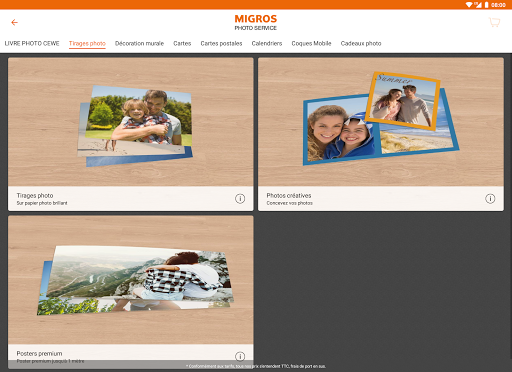 Avec l’application Migros Photo Service, créez des produits photo tels que des livres photos CEWE, des calendriers photo, des posters muraux, des tirages photos, des cartes postales et bien plus encore. Profitez des possibilités de conception illimitées, même hors ligne. Toutes vos commandes sont livrées par la Poste chez vous ou gratuitement dans n’importe quel magasin melectronics ou dans certains magasins Migros. >> Highlights de l’application ● De beaux designs, fonds, layouts et plus ● Utilisation de l’écriture et de la peinture ● Pas de limitation de photos et création libre ● Assistant de conception - un livre photo en 5 minutes ● Garantie de satisfaction >> Livre photo Les livres photo CEWE de MIGROS Photo Service sont disponibles en différentes variations. Choisissez parmi 6 formats, ainsi que différents types de couvertures et de papiers. Formats: Mini (15x11 cm), A5 Panorama (19x15 cm), Carré (21x21 cm), Large (21x28 cm), A5 Panorama (28x21 cm), XL (30x30 cm) Couverture: Couverture rigide, couverture souple, couverture carnet, couverture en cuir, couverture en toile Types de papier: papier photo mat et brillant, impression numérique ou avec finition brillante Nombre de pages: 26 - 178 pages Délai de livraison: 2 - 7 jours ouvrables >> Calendrier Photo Chaque mois est personnalisable. Créez des calendriers avec vos photos, avec une variété de calendriers, de couleurs, de mises en page et de types de papier. Choisissez parmi des calendriers muraux et de bureau en différents formats et tailles. >>>Posters muraux Avec l\application MIGROS Photo Service, vous pouvez concevoir et commander des posters et des toiles pour la décoration murale. Choisissez vos préférés: ● Affiche de qualité supérieure sur papier photo mat, brillant, nacré, satiné ou Fine Art Mat de 20x20 cm à 30x90 cm ● Toile 20x20 cm à 60x90 cm ● Poster autocollant 20x30 cm à 30x90 cm ● Carton mousse 20x20 cm à 60x90 cm ● Support alu 20x20 cm à 60x90 cm ● Poster sous plexi 20x20 cm à 60x90 cm >>>Photos et tirages Impressions imprimées dans les formats 9x13 (env. 9cm de haut),10x15, 11x17, 13x18. La longueur est déterminée par rapport à l’aspect de l\image; rien n\est coupé. Les tirages sont recommandés pour les photos dans des proportions 3:2 (réflexe miroir) et 4:3 (appareil photo compact). Pour les panoramas, nos \Panoramas\ sont proposés. Avec des photos créatives, vous pouvez découper et dessiner vos impressions. >>>Cartes de voeux Créez vos propres cartes de voeux (p. ex. invitation de mariage, de naissance, d\anniversaire) dans différents formats et tailles - qu\elles soient classiques ou pliables. >>>Carte postale directement expédiée Créez votre propre carte postale à partir de 2.45 CHF. Utilisez votre photo comme timbre ou créez un message vidéo que le destinataire peut lire à partir d\un QR code sur la carte. >>>Créez vos coques de smartphone et de tablettes Protégez vos appareils mobiles avec une coque de haute qualité et mettez en valeur l\arrière de votre appareil avec votre photo préférée. Les couvertures imprimées de tablette ou de téléphone portable sont un cadeau idéal pour un anniversaire, une crémaillère ou un mariage. Vous pouvez commander les produits suivants: ● Coque rigide pour smartphone ● Coque en silicone pour smartphone ● Coque Premium mat/brillant pour smartphone ● Coque renforcée pour smartphone ● Housse rabat côté pour smartphone ● Housse rabat bas pour smartphone ● Étui Smartphone ● Étui Apple iPad ● Etui Premium pour tablette >>> Paiement ● Facture ● VISA / MasterCard ● En liquide si retrait en magasin
