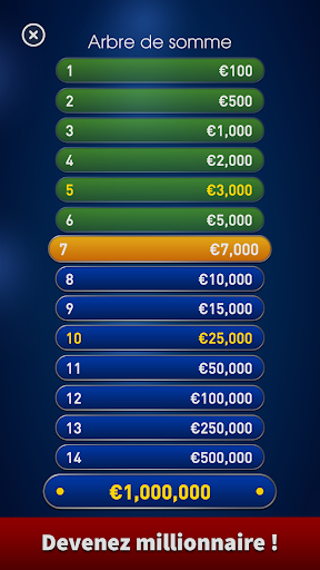 Millionnaire Quizz - un jeu de quiz de culture générale nouvellement conçu ! Entraînez votre cerveau avec plus de 15000 questions intéressantes et populaires. Un tout nouveau mode SUPERMILLIONER avec 25 questions, 5 indices et un premier prix de 5 millions ! Il ne ressemble à rien de ce que vous avez vu auparavant ! Pour les fans de la version classique du jeu, nous proposons un mode avec 15 questions et un prix de 1 000 000. Vous un Toujours Attire par SES des questions interessantes et par l\adrénaline? Maintenant you have le hasard de Gagner Votre premier 3.000.000 (same si seulement virtuel) avec l\aide de Vos connaissances heuristiques. Testez votre intellect de résistance! Juste 15 questions. Quatre variantes de Reponse. La Difficulté des Questions s\accroit with la Somme proposed. La victorine contains 15.000 des questions! Seulement 1% peut atteindre la 15ème question! Vous pouvez utiliser les points que vous gagnez pour acheter toutes sortes de choses, des véhicules et même des biens immobiliers ! Avez-vous de vastes connaissances en trivia? Jouez à des jeux contre votre famille, vos amis et d\autres joueurs pour gagner ! Montrez que vous en savez le plus en répondant à des questions dans différentes catégories comme la nature, le sport, la science, le cinéma, la musique et la géographie. Devenez le maître des anecdotes en apprenant des faits amusants et intéressants ! CARACTÉRISTIQUES DE JEU: - 15000+ questions-questions - Différentes catégories - Différentes difficultés - Testez votre QI et vos connaissances générales - Jeu fluide et interfaces agréables - Prise en charge des téléphones et des tablettes - Apprenez et détendez votre esprit Affrontez vos amis pour gagner des millions ! Pour gagner, vous devez vraiment activer votre intellect et avoir de la chance. La Base de question Est Toujours Renouvelée. Il y en a plus de 15 000! L\Interface is confortable et compréhensible Avec la graphique éclatante. Il y a le tableu des records de l\échelle Mondiale. Inscrivez Votre nom Dans l\histoire des batailles intelectuelles! You can Voir tous Vos Résultats Dans Une section spéciale. Bientôt les question des catégories spéciales will be DISPONIBLES DANS LE jeu et vous Aurez l\Opportunité de Jouer avec Vos amis. Millionnaire Quizz 2025 : Qui veut des millions Vous pourrez Apprendre beaucoup d\informations nouvelle Et De Faits interessants! Qui veut gagner des millions?