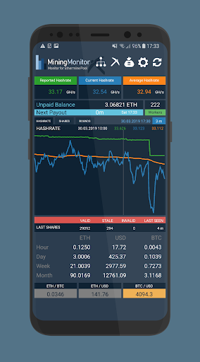 Mining Pool Monitor for Ethermine pool Unofficial monitoring application for checking your ETH & ETC mining and statistics on Ethermine pool. Features - Reported hashrate (MH/s) - Effective current hashrate (MH/s) - Effective average hashrate (last 24h) - Unpaid balance of Ethereum (ETH/ETC) - Current Workers (features list below) - Calculated time to next Ether - ETH or ETC per minute/hour/day/week/month - USD per minute/hour/day/week/month - BTC per minute/hour/day/week/month - Chart success of mining at the time - Currency exchange rates price ETH/BTC, ETH/USD, BTC/USD - Optimalization for small and big miners - Pool settings info - Account address history - Payment transactions (max. 100 last payments) - Average time to next payments (duration) - Tx link to etherchain transaction - Network & Pool info page Worker\s detail page - Workers Id - Effective hashrate - Reported hashrate - Shares (Invalid / Stale / Valid / % Invalid)