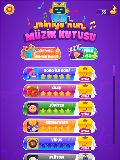 Miniyo\nun Müzik Kutusu oyunu yayında! Miniyo nun sevilen şarkılarıyla müzik yeteneğini keşfetmeye hazır mısın? Müziğe eşlik et, ritmi yakala, puanları kazan. Miniyo ile eğlenceli bir yolculuğa hazır ol! Miniyo\nun Müzik Kutusu oyununda Miniyo Youtube kanalının en sevilen şarkıları bulunuyor. Bunlardan bazıları; - Gezegenler Şarkısı - Jüpiter Şarkısı - Dinozor Dünyası - Çilek Şarkısı - Rogo ile Gobi - Merkür Şarkısı ve daha fazlası. Aileler İçin: Değerli ebeveynler ve öğretmenlerimiz, Miniyo\nun Müzik Kutusu uygulaması ile çocuklarımız en sevilen Miniyo şarkılarına ritmik olarak eşlik ederek hem eğlenecekler hem de ritim duygularını geliştirecekler. Uzman ekibimiz tarafından üretilen bu uygulamada amacımız çocukların eğlenmesi ve müzikal becerilerinin geliştirilmesi oldu. Hazırladığımız 3 farklı zorluk düzeyi sayesinde 4 yaşından 10 yaşına kadar olan çocukların oynaması mümkündür. Uygulamamız içerisinde yer alan çocuklara yönelik reklamları kaldırmak isterseniz ayarlar bölümünden satın alma yaparak reklamları kaldırabilirsiniz. Öneri ve eleştirilerinizi bize yazabilirsiniz, miniyogamestudio@gmail.com. Gizlilik Politikası: Kişisel veri güvenliği dikkat ettiğimiz bir konudur. KVKK gereğince kullanıcıların kişisel verileri üçüncü kişilerle paylaşılmamaktadır.