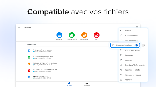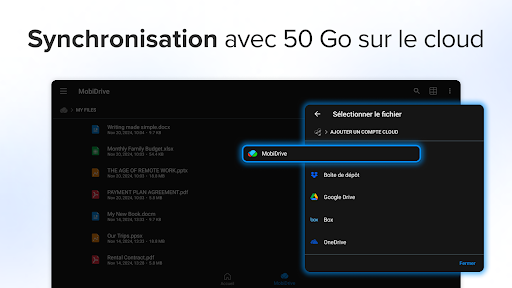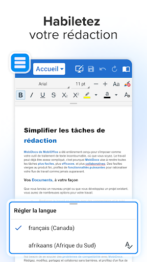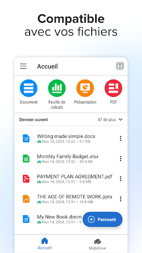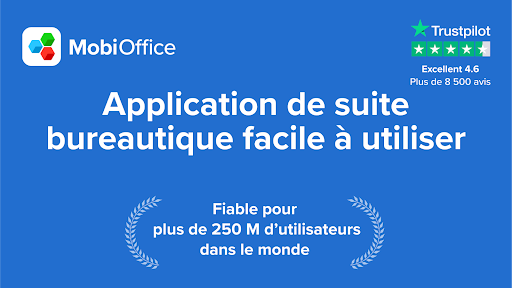 MobiOffice est un choix judicieux pour la productivité au bureau. Offrant toutes les fonctionnalités dont vous avez besoin pour afficher, modifier et créer des documents PDF, Word, Excel et PowerPoint, MobiOffice est la solution la plus riche et aux fonctions intégrées les plus complètes pour l\utilisation personnelle et professionnelle sur les appareils mobiles. Documents, feuilles de calcul et présentations • Applications performantes dotées d\une panoplie d\outils utiles pour gérer toutes les tâches. • Toutes les fonctionnalités avancées dont vous avez besoin : mise en forme de Painter, suivi des modifications, formatage conditionnel, formules, mode de présentation, et plus encore. • Interface de style bureautique familière que vous connaissez et que vous aimez. • Exportez des documents Word, Excel ou PowerPoint aux documents PDF. • Options de sécurité avancées. Gestion avancée de documents PDF • Ouvrez, affichez et annotez des documents PDF. • Travaillez avec des formulaires remplissables. • Signez numériquement des documents PDF. • Gestion améliorée de la sécurité et des autorisations. • Convertissez des documents PDF en documents Word, Excel et ePub. Conçu pour travailler lors des déplacements. • Stockage en nuage intégré pour un accès facile aux dossiers. Obtenez 5 Go gratuits sur notre nuage MobiDrive ou liez vos comptes Google Drive, OneDrive, Box ou Dropbox existants. • Capacités multiplateformes qui lient votre Windows PC à tous vos appareils mobiles Android et iOS. • Compatibilité avec les formats de fichiers populaires : Microsoft, OpenOffice, iWork d\Apple, et des centaines d\autres. • Disponible en plus de 65 langues. • Interface pratique et conviviale optimisée pour la toute dernière version d\Android. MobiOffice est installée gratuitement et peut être utilisée pour lire et afficher des documents. Commencez votre essai gratuit de 7 jours et voyez tout ce qu\MobiOffice a à offrir, notamment la modification de documents et tous les autres outils et fonctionnalités avancés. Si vous aimez votre expérience, nos plans tarifaires flexibles mensuels et annuels vous permettent de choisir la solution qui répond le mieux à vos besoins. Les bénéfices Premium comprennent : • Capacité de stockage de 50 Go sur MobiDrive; • Conversions de documents PDF illimitées; • Déverrouillage de plus de 20 fonctionnalités avancées; • Utilisation sur deux appareils mobiles et un Windows PC; • Aucune annonce publicitaire; • Soutien prioritaire.