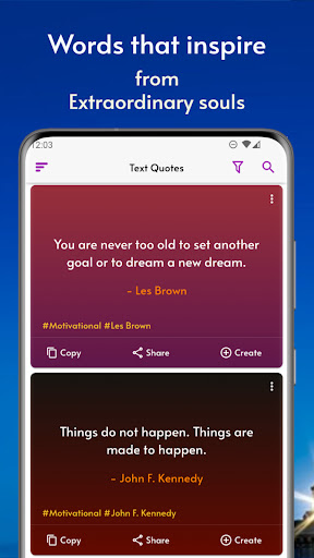 Your Daily Source of Motivation and Inspiration! Stay motivated every day with powerful quotes, inspirational videos, and tools designed to uplift your mindset and help you achieve your goals. This Motivation app is the ultimate app for anyone seeking daily encouragement, positive thinking, and a supportive community of like-minded individuals. Whether you’re starting your day, tackling challenges, or setting new goals, our motivation app ensures you stay focused, energized, and inspired to be your best self. Why millions of users love our Motivation app Daily Motivational Quotes Start each morning with handpicked motivation quotes that inspire, encourage, and push you to take action. Receive daily notifications so you never miss a moment of motivation in daily life. Create Your Own Quotes Unleash your creativity with the built-in quote maker. Design custom motivational quotes with beautiful backgrounds, colors, fonts, and emojis. Share your creations with the world! Motivational Videos Ignite your passion and keep moving forward with captivating videos filled with powerful messages and stories of inspiration. Join a Motivational Community Connect with others who share your goals and passions. Post your quotes, engage with uplifting content, and build a positive network of encouragement. Motivation on Your Home Screen Add widgets to your home screen and get inspired all day with quotes displayed right where you need them. Quotes for Every Moment Discover quotes for every aspect of your life—success, positivity, self-love, health, relationships, and even festive celebrations. Whatever you’re going through, there’s a quote to guide and uplift you. Relax with Breathing Exercises Recharge your mind and reduce stress with simple breathing exercises. Combine motivation with mindfulness to create a balanced daily routine. Daily Status/Stories Inspire others by sharing motivational images in your status or story, available for 24 hours. Timeless Wisdom Explore quotes from legendary figures, beautifully designed to captivate and motivate you every day. Special Features You’ll Love Personalized Categories: Select your favorite categories and customize your homepage to see quotes and images that resonate with you. Festival-Specific Quotes: Celebrate special occasions with themed motivational quotes perfect for sharing with friends and family. Daily Notifications: Stay on track with motivational reminders to keep you focused on your goals. Social Sharing: Spread positivity effortlessly by sharing quotes, videos, and stories with a single tap. How to Use the App: Download and Install: Start your journey with motivation by downloading the Motivation - 365 Daily Quotes app. Choose Your Favorites: Select the motivational categories that suit your goals and interests for home page. Receive Daily Inspiration: Get quotes, videos, and reminders sent straight to your phone. Share and Connect: Create and share quotes, join the community, and inspire others with your positivity. Why Motivation Matters: Life can be challenging, but with the right mindset, you can overcome anything. Our Motivation Quotes app helps you stay inspired, build better habits, and focus on what truly matters. Whether you need motivation to start a new project, stay consistent with your fitness routine, or find strength during tough times, this app is your daily companion. Transform Your Life with Daily Motivation! Download Motivation - 365 Daily Quotes today and take the first step toward a more positive, productive, and inspired life. With a simple daily habit, you can achieve your dreams, conquer challenges, and uplift those around you—one motivational quote at a time. Disclaimer: All images used in the app are for aesthetic purposes and belong to their respective owners. No copyright infringement is intended. We will act quickly to remove images upon request.