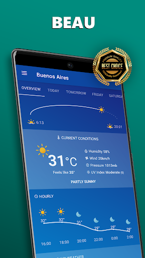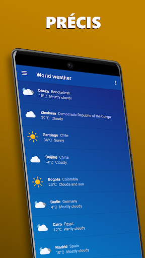 Prévisions météo gratuites, simples et fiables sans publicité pour n\importe quel endroit dans le monde. Vous pouvez utiliser la position GPS ou saisir le nom de la ville manuellement (aucune autorisation supplémentaire n\est requise). L\application météo contient des informations de base sur les conditions actuelles et les prévisions pour les prochains jours présentées de manière claire et simple. Informations météorologiques de base : - température - humidité - vitesse et direction du vent - pression - nébulosité - précipitation - photos satellites Il existe également des radars météorologiques, des cartes météorologiques et des images satellites en direct dans l\application météo. Il s\agit d\une nouvelle application qui est mise à jour régulièrement, donc si vous souhaitez améliorer quelque chose, faites-le moi savoir, nous nous améliorerons et ensemble nous créerons l\application de prévisions météo n°1 sur le Play Store.
