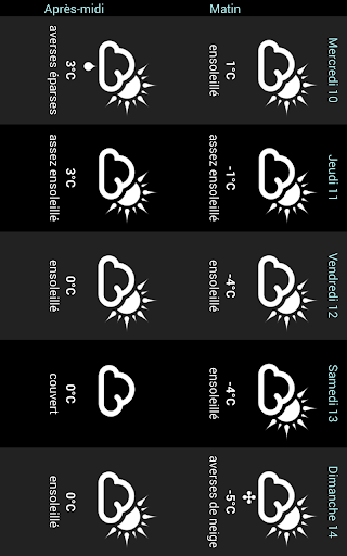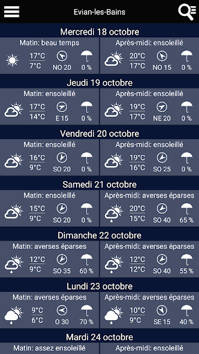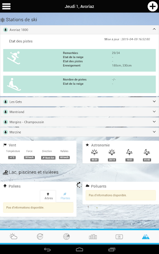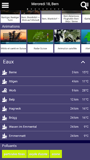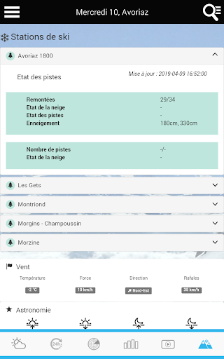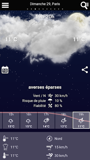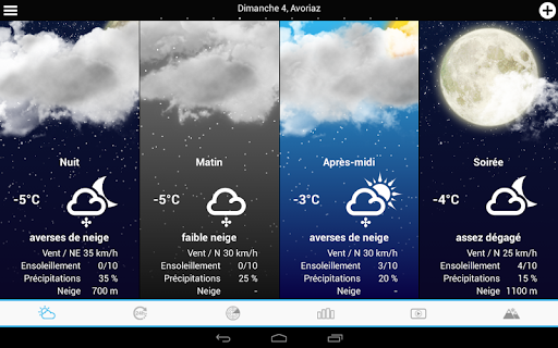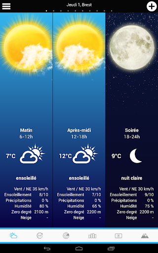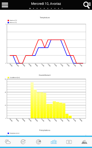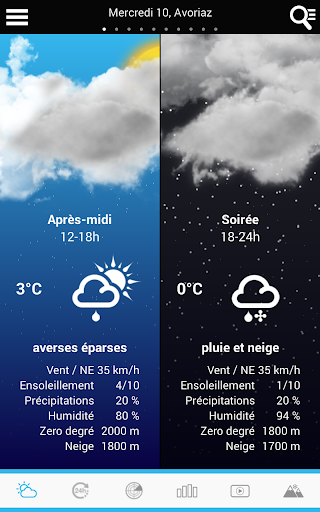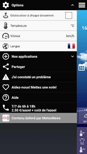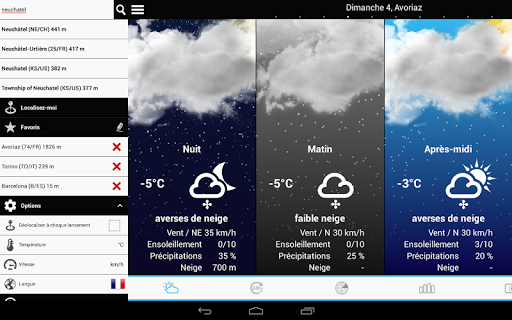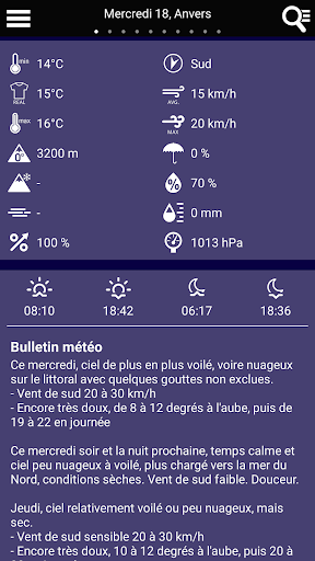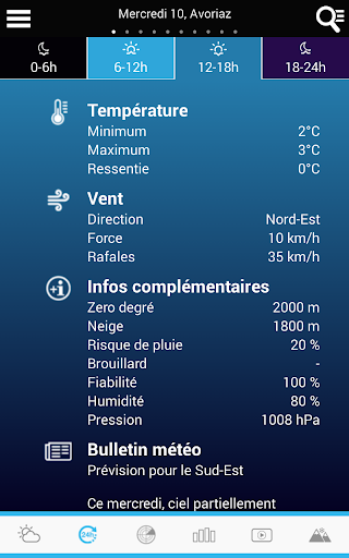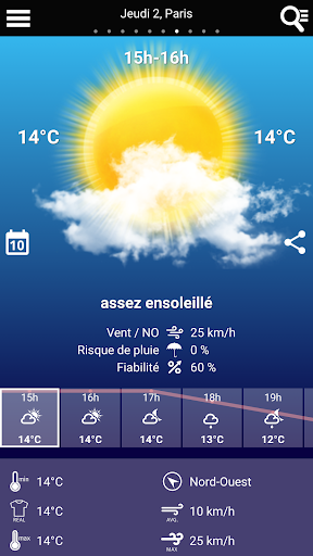 Retrouvez chaque jour rapidement et simplement la situation actuelle et les prévisions météo pour votre région ou toute autre ville de la planète actualisées en temps réel par des météorologues! LES INFORMATIONS DÉTAILLÉS - Prévision météo pour chaque heure de la journée en Suisse, France et en Belgique. - Prévisions par tranche de 3 heures dans le monde entier - Valeur de la fiabilité des prévisions - Probabilité d\ensoleillement et de précipitations - Température moyenne, minimale et maximale - Température ressentie - Force et direction du vent, force des rafales de vent - Précipitations en mm - Alertes - Brouillard - Limite des chutes de neige - Limite zéro degré - Lever et coucher du soleil et de la lune - Température des mers - lacs - rivières - Niveau de pollution - Visibilité rapide pour 10 jours Options printemps - été - automne de www.meteoFun.com - Météo des plages - Température des mers - lacs - rivières - piscines - Informations sur les allergies avec situation des pollens pour les arbres et les plantes Options supplémentaires pour l\hiver - Meteo des neiges - Toutes les stations en France et en Suisse avec états des pistes pour; ski – ski de fond - luge - Vérifier l’enneigement grâce aux webcams en direct des pistes de ski La météo mieux qu\à la télévision: - Flash et journal TV présenté trois fois par jour en France, Suisse et en Belgique. - Flash TV de la météo du week-end, la météo routière, les tendances saisonnière, la météo en Europe disponible en FR, CH et BE - Animation radar pour 3 heures - Radar des précipitations, du vent, le satellite, les courants - Webcams animées en Suisse, France et en Belgique Choix de votre ville et même les plus petits villages que vous connaissez! Source et partenaire: MeteoNews SA