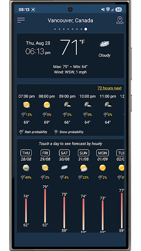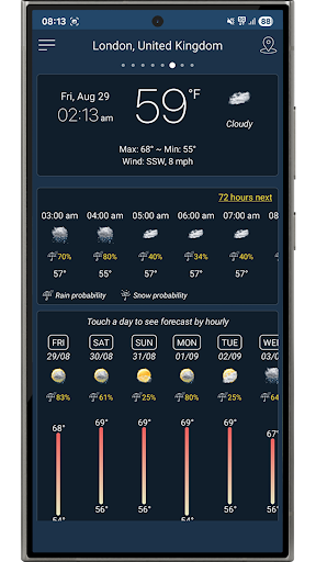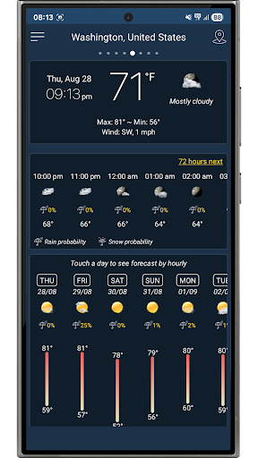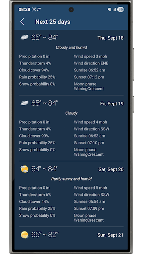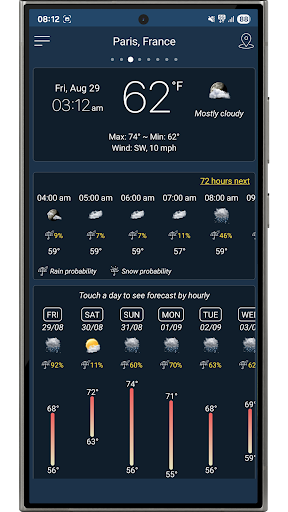 Prévisions quotidiennes et horaires précises, alertes météo et widgets en direct. Météo – Prévisions et alertes précises Obtenez les meilleures prévisions météo gratuites avec des mises à jour en temps réel, des détails horaires et quotidiens, et des prévisions à long terme jusqu\à 25 jours. Soyez prêt où que vous soyez, à tout moment ! Principales fonctionnalités Prévisions précises – Prévisions horaires, quotidiennes et sur 25 jours Couverture mondiale – Météo pour tous les pays et toutes les villes du monde Mises à jour en temps réel – Température, pluie, neige, vent, humidité, indice UV Alertes météo – Tempêtes, pluie, neige et conditions extrêmes Localisation intelligente – Détection automatique de votre position actuelle via GPS et réseau Prise en charge multi-villes – Recherchez et gérez plusieurs lieux favoris Widgets et notifications – Accès rapide à la météo en direct sur votre écran d\accueil Paramètres personnalisés – Unités de température (°C/°F), vent, précipitations et format horaire Rapports détaillés – Lever, coucher du soleil, pression, visibilité, point de rosée et plus encore Graphiques interactifs – Suivez facilement les tendances horaires et quotidiennes Pourquoi choisir Météo – Prévisions et alertes précises ? • Prévisions mondiales et locales précises • Rapide, simple et léger • Conçu pour la confidentialité Votre vie privée est importante Votre localisation est utilisée uniquement pour fournir des prévisions locales précises. Aucune donnée personnelle n\est stockée ni partagée. Gardez une longueur d\avance avec Prévisions Météo : votre compagnon quotidien idéal ! Téléchargez gratuitement dès maintenant et profitez de prévisions précises chaque jour.