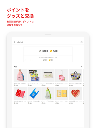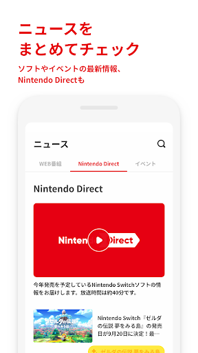「マイニンテンドー」は、任天堂のゲーム体験がより楽しく、便利に、おトクになる、無料でご利用いただけるアプリです。 このアプリでは、マイニンテンドーポイントの残高のほか、Nintendo Switchであそんだ記録や「きになる」ソフトの最新情報、マイニンテンドーストアのソフトやグッズなどをチェックできます。また、任天堂オフィシャルストア「Nintendo TOKYO / OSAKA / KYOTO」などの店舗や様々なイベントで実施しているチェックインにもこのアプリが便利です。 「マイニンテンドー」アプリの主な機能 ◆ マイニンテンドーポイントの残高を確認 ・マイニンテンドーゴールド/プラチナポイントの残高を確認できます。 ・月末に有効期限が切れるポイントも確認でき、有効期限が切れる前には通知でおしらせします。 ・プラチナポイントで交換できるグッズの情報を確認できます。 ・プラチナポイントの有効期限が切れる前に、最新のグッズ情報をチェックしてみてください。 ◆ あそんだ記録を確認 ・Nintendo Switchであそんだり、チェックインをした「最近のきろく」を確認できます。 ・いつ、どのソフトを、どれくらいあそんだのか、過去1週間のあそんだ記録を1日単位で見ることができます。 ・GPSやQRコードでイベントにチェックインした記録も見ることができます。 ・これまでにあそんだソフトの一覧を確認できます。 ・Nintendo Switchや、2020年2月末までにニンテンドー3DSとWii Uであそんだソフトの記録を見ることができます。※1 ・「もっとも長くあそんだゲームソフトは?」「はじめてあそんだ日は?」。 懐かしい思い出を辿ると、意外な発見があるかも。あそんだソフトは様々な順番で並び替えたり、表示/非表示を選択したりできます。 (※1)ニンテンドー3DSとWii Uの記録を見るには、ニンテンドーアカウントとニンテンドーネットワークIDの連携が必要です。 ◆ 「きになる」ソフトの最新情報をチェック ・Nintendo Switchのゲームソフト、ライブイベント、キャラクターグッズなどの様々なニュースをお届けします。 ・ニュースを「きになる」すると、関連記事や続報を確認したり、「ホーム」でもうすぐの予定を確認することができます。 ・任天堂が最新情報を直接おしらせする「Nintendo Direct」もこのアプリで視聴できます。最新の放送予定は通知でもおしらせしますので、ライブ配信の見逃し防止にもお役立てください。また、過去のアーカイブ動画などもアプリから見ることができます。 ◆ マイニンテンドーストアでお買いもの※2 ・Nintendo Switchのゲームソフト、キャラククターグッズ、ストア限定商品など、マイニンテンドーストアならではの商品が盛りだくさん。 ・「最新作」や「セール」など、いろんなNintendo Switchソフトの情報をサクサク見ることができます。 ・お買い得も見逃さない。気になった商品をマイニンテンドーストアの「ほしいものリスト」に入れておくと、 「セール」になったときに通知でおしらせします。 (※2)このアプリからマイニンテンドーストアに進むことができます。 ◆ GPSでチェックイン ・お使いの端末のGPS機能を利用して、任天堂オフィシャルストア「Nintendo TOKYO / OSAKA / KYOTO」やそのほか様々なイベントでチェックインできます。※3 (※3)GPSチェックイン機能をご利用になる場合は、お客さまのお使いの端末で位置情報の利用を許可する必要があります。GPSチェックインが利用できる場所やイベントは、時期によって異なります。 ◆ニンテンドーアカウントのQRコードを表示 ・「Myページ」からニンテンドーアカウントのQRコードをすぐに表示することができます。 ・任天堂オフィシャルストア「Nintendo TOKYO / OSAKA / KYOTO」での商品購入時や、特定のイベントなどで提示すると特典が受け取れることも。 ・イベントの情報はアプリの「ニュース」などでおしらせしますのでお見逃しなく。 【ご利用にあたって】 ・このアプリの一部機能をご使用いただくには、ニンテンドーアカウントでログインが必要です。 ・アプリの使用にはインターネット通信が必要です。データ通信量がかかる場合があります。 ・このアプリを使用するには、Android 8.0以降のバージョンのOSをインストールした端末が必要です。 QRコードは、株式会社デンソーウェーブの登録商標です。 2020 Nintendo