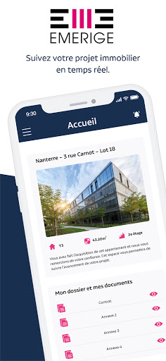 Avec MyEmerige, vivez une expérience client simple et personnalisée ! Suite à la signature de votre contrat de réservation, accédez à votre espace client et retrouvez l’ensemble de vos documents personnels et les caractéristiques de votre projet. Complétez votre dossier, suivez les étapes en cours et celles à venir, consultez en image l’actualité de votre résidence à distance, échangez facilement avec vos interlocuteurs Emerige. De la réservation à la livraison de votre logement, Emerige vous accompagne à chaque étape de votre achat !