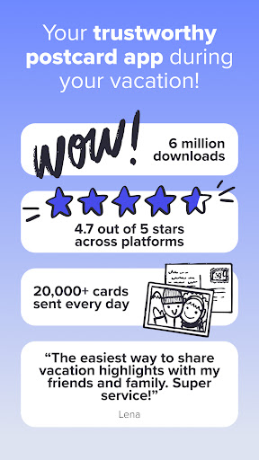 30% de réduction sur votre première carte postale photo avec le code SALUT30 Envoyez en quelques clics des cartes postales personnalisées dans le monde entier avec MyPostcard ! La meilleure application 2022 de cartes postales vous permet d\ajouter vos propres photos à des modèles de cartes ou à des designs personnalisables et de les envoyer par courrier à vos proches, où qu\ils se trouvent dans le monde. Envoyez des cartes postales personnalisées dans le monde entier en quelques clics Depuis votre Airbnb de vacances ou votre fauteuil à la maison, MyPostcard s\assure que vos vœux parviennent à vos proches, avec la livraison internationale gratuite sur toutes les cartes ! L\application de cartes postales la plus simple d’utilisation MyPostcard est l\appli de carte postale la plus intuitive, vous guidant facilement à travers le processus de conception et d\achat pour un processus rapide. Choisissez parmi plus de 70 000 modèles personnalisables Cartes de Saint-Valentin, Pâques, fête des mères ou de Noël... Nous avons les plus beaux design ! Revivez et partagez vos souvenirs préférés avec MyPostcard Envoyez vos photos à vos proches comme cadeaux ou vœux, ou utilisez-les pour décorer. Choisissez parmi : - Cartes postales à partir de 2,69 € : Un classique, et notre produit le plus populaire pour une bonne raison ! Plus de 70 000 designs personnalisables, vous pouvez également opter pour un modèle de carte postale classique avec entre 1 et 9 supports photo. Modifiez la bordure, appliquez des filtres, ajoutez du texte, lâchez-vous ! - Cartes de vœux à partir de 3,69 € : Tout ce que vous pouvez faire avec la carte postale, mais avec en prime une photo supplémentaire à l\intérieur, un espace pour signer numériquement et bien sûr, une enveloppe incluse. - Cartes XXL à partir de 7,69 € : Aussi simple que cela puisse paraître : une version XXL de votre carte postale ou de votre carte de vœux ! - Cartes supersize à partir de 39,99 € : Et nous disons bien \super\. Elles sont énormes ! - Cartes audio à partir de 7,99 € : La SEULE carte audio personnalisable à la demande au monde. Ajoutez votre propre message vocal, vos plus belles photos et enfin un message pour en faire la carte ultime. - Cartes vidéo à partir de 4,49 € : Avec toutes les caractéristiques des cartes de vœux classiques, la carte vidéo vous permet d\aller plus loin dans vos vœux ! - Tirages photo à partir de 5,99 € : Cultivez un bel ensemble de 15, 22 ou 30 photos au format normal, carré ou polaroïd. - Cadre Umbra à partir de 25,00 € - Tirage encadré à partir de 29,90 € Comment utiliser MyPostcard 1. Téléchargez l\application et inscrivez-vous. 2. Sur l\écran d\accueil, choisissez votre produit ou recherchez un design de carte via l\onglet \Designs\. 3. Suivez les étapes suivantes pour personnaliser entièrement votre produit avec du texte ou des photos. 4. Saisissez l\adresse du destinataire ou ajoutez-la à partir de votre carnet d\adresses. 5. Payez par crédit, carte, virement bancaire ou PayPal. 6. Nous imprimons et envoyons ! Envoi international gratuit pour toutes les cartes Voici nos délais de livraison *estimés*: États-Unis : 3-5 jours ouvrables Royaume-Uni : 1-3 jours ouvrables Canada : 3-5 jours ouvrables Europe : 2-5 jours ouvrables Australie : 6-10 jours ouvrables Asie : 6-10 jours ouvrables Autres pays : 6-14 jours ouvrables MyPostcard sur les réseaux sociaux Faites partie de notre communauté dès aujourd\hui en nous suivant sur Instagram via @mypostcardapp ou sur Facebook via @mypostcard.global. Partagez vos souvenirs avec #MyPostcardMoment pour avoir une chance de figurer dans notre feed ! Vous avez encore des questions ? Vous avez des questions ou des commentaires ? Contactez notre service client par email: support@mypostcard.com