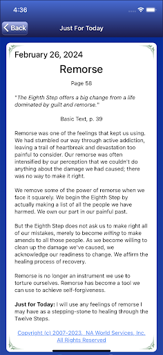 NA Meeting Search is an application developed to help you locate In-Person or Virtual NA meetings. The app provides links to service bodies that list NA meetings near your location, as well as virtual meetings organized by day and time. Also bundled in the app is a clean time calculator, the daily Just For Today and Spiritual Principal a Day readings, and links to some of www.NA.Org’s website resources.