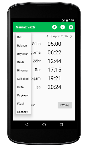 Namaz vaxtı proqramı Azərbaycan Respublikasının şəhər və rayonları üçün namaz və oruc vaxtlarını göstərən proqramdır. Proqram oflayn (offline) rejimdə işləyir, internet bağlantısına ehtiyac yoxdur. Həm namaz vaxtları, həm də ramazan təqvimi (oruc - imsak və iftar vaxtları) üçün istifadə oluna bilər. Vaxtlar qafqazislam.com (Qafqaz Müsəlmanları İdarəsinin rəsmi saytı) saytından götürülmüşdür. İlk açılanda Bakı üçün bu günün namaz vaxtları görünür, yuxarı sol tərəfdə siyahıdan digər şəhər/rayonu seçə bilərsiniz. Namaz vaxtı azan oxuma üçün proqramda aşağıda \Azan oxusun\ seçin. Aşağıdakı Paylaş düyməsi ilə proqramı Facebook və ya digər sosial şəbəkələrdə paylaşa bilərsiniz. Proqramda qiblə kompası ilə qibləni təyin edə bilərsiniz (telefonda kompas sensoru varsa). Seçimlər bölməsində aşağıdakı seçimləri edə bilərsiniz: 1) Müxtəlif azan səsi və xəbərdarlıq səsi seçmək 2) Hansı vaxtlarda azan oxumasını seçmək 3) İmsak və gecə yarısı vaxtlarını göstərməyi seçmək