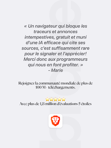 Naviguez 3 fois plus rapidement sur Brave Browser, désormais avec IA. Vous bénéficierez d’un navigateur Web sécurisé, rapide et privé avec Adblock et VPN. Adopté par 75 millions d\utilisateurs, Brave dispose de l\assistant IA Brave Leo, d’un Firewall et d’un VPN, de Brave Search et d\un mode nuit. NOUVELLES CARACTÉRISTIQUES DE L’APPLICATION ✓ Brave Leo: assistant IA ✓ Firewall + VPN ✓ Brave Search. Moteur de recherche privé et indépendant. ✓ Mode nuit. Pour lire en basse luminosité. CARACTÉRISTIQUES SUPPLÉMENTAIRES ✓ Recherche privée et indépendante ✓ Adblock Navigateur Web intégré ✓ Bloqueur de pop-up ✓ Économise les données et la batterie ✓ Bloque les publicités intrusives ✓ Synchronise les signets en toute sécurité ✓ Protection contre les trackers sur le web ✓ HTTPS Everywhere (à des fins de sécurité) ✓ Blocage de script ✓ Blocage de cookies tiers ✓ Signets ✓ Historique ✓ Fenêtre de navigation Web privée ✓ Onglets de navigation récente ✓ Moteur de recherche rapide ✓ Importez/exportez des signets depuis/vers un autre navigateur. ✓ Blocage des bannières de consentement aux cookies par défaut. ✓ Supprime les codes de suivi lorsque vous copiez des URL. Prise en charge d’Android 7 et au-delà. Assistant IA Découvrez Brave Leo, l\assistant IA intelligent et gratuit inclus dans votre navigateur. Posez des questions, obtenez des réponses, effectuez des traductions et bien plus encore. Leo n\enregistre ni ne partage vos discussions, et ne les utilise pas pour la formation de modèles. Brave Search - Recherche privée Brave Search est le moteur de recherche privé le plus complet, performant et indépendant au monde. Il ne vous suit pas, et ne suit ni vos recherches ni vos clics. Navigation privée et rapide Profitez d’une navigation rapide, sécurisée et privée. Obtenez un bloqueur de publicités gratuit, votre historique de navigation anonyme, une fonction de recherche privée personnalisée et des onglets privés. Naviguez plus rapidement Brave est un navigateur Web rapide ! Brave réduit les temps de chargement des pages, améliore les performances du navigateur Web et bloque les publicités infectées par des logiciels malveillants. Protection de la vie privée Soyez protégé grâce à des fonctionnalités de pointe en matière de confidentialité et de sécurité telles que HTTPS Everywhere (cryptage du flux de données), le blocage des scripts, le blocage des cookies et les fenêtres de navigation privées. Aucun autre navigateur n’atteint les performances de Brave en matière de protection de la confidentialité et de la sécurité. Brave Rewards Avec votre ancien navigateur Web, vous payiez pour naviguer sur Internet en visionnant des publicités. Désormais, vous êtes réellement récompensé pour votre attention. A propos de Brave Notre mission est de protéger votre vie privée en ligne en créant un navigateur sécurisé, rapide et privé tout en augmentant les revenus publicitaires des créateurs de contenu. Brave vise à transformer l\écosystème publicitaire en ligne avec des micropaiements et une nouvelle solution de partage des revenus pour offrir aux utilisateurs et aux éditeurs la meilleure offre possible. Pour en savoir plus sur Brave, visitez https://www.brave.com. Contactez-nous sur https://brave.com/msupport. Conditions d’Utilisation: https://brave.com/terms-of-use/ Politique de Confidentialité: https://brave.com/privacy/