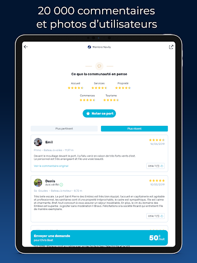 Avec 850.000 plaisanciers utilisateurs, Navily est le compagnon idéal pour toutes vos sorties en mer : - Un guide côtier avec plus de 35 000 ports et mouillages référencés - 300 000 photos et commentaires de la communauté - Réservation facile dans plus de 700 ports en Europe - Messagerie avec les ports et les autre plaisanciers - Alertes en temps réel sur les mouillages et Alertes SOS avec la communauté *** Naviguez malin grâce aux avis des plaisanciers locaux *** Découvrez plus de 300.000 avis partagés par la communauté avec photos, commentaires, informations sur la protection, le type de fond et bien plus encore. Tous les commentaires sont traduits en français et l’information est mise à jour en continu par notre communauté de passionnés de la mer. *** Réservez une place de port partout en Europe *** Avec plus de 700 ports partenaires à travers l’Europe et un réseau en forte croissance, Navily vous aide à sécuriser une place de port en quelques clics. Navily travaille en partenariat direct avec les ports pour vous fournir des informations mises à jour par les ports eux-mêmes : une grille tarifaire complète, horaires, événements, lieux touristiques, équipements et services... Envoyez vos demandes d’escales directement au port qui vous répondent dans l’application. *** Partagez votre expérience *** Aidez la communauté en partageant votre expérience sur les mouillages et les ports que vous visitez. Partagez vos photos, vos commentaires et participez au développement du plus innovant des guides côtiers. *** Navily Premium pour encore plus de fonctionnalités *** Débloquez de nouvelles fonctionnalités ! Prédictions Météo et scoring à 72hr, Calcul de distances et itinéraires automatiques, Mode hors-ligne, Filtres avancés sur la carte & pas de Publicité *** Dernières nouveautés *** - Nouveau mode Hors-ligne avec carte - Nouveaux filtres sur la carte - Refonte de la recherche - Chat inApp entre utilisateurs - Calculs de distances et itinéraires automatiques - SOS en mer pour demander de l’aide à la communauté - Signalez en temps réel sur les mouillages : mauvais temps, méduses, requins… Navily est aussi disponible en Anglais, Italien, Espagnol et Allemand Une idée ou un commentaire ? Suivez-nous sur les réseaux sociaux et venez partager votre passion pour la mer ;) Facebook : https://www.facebook.com/navilyapp Twitter : https://twitter.com/navilyapp Instagram : http://instagram.com/navilyapp Blog : http://blog.navily.com/ Website : https://www.navily.com/ Politique de confidentialité : https://www.navily.com/privacy Conditions générales d\utilisation : https://www.navily.com/cgu