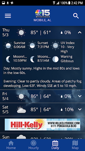 NBC 15 WPMI Weather is proud to announce a full featured weather app for Android. Features • Access to station content specifically for our mobile users • 250 meter radar, the highest resolution available • Future radar to see where severe weather is headed • High resolution satellite cloud imagery • Current weather updated multiple times per hour • Daily and Hourly forecasts updated hourly from our computer models • Ability to add and save your favorite locations • A fully integrated GPS for current location awareness • Severe weather alerts from the National Weather Service • Opt-in push alerts to keep you safe in severe weather