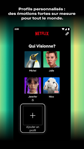 Les séries et les films dont tout le monde parle? Ne cherchez plus, vous les trouverez sur Netflix. Nos séries, films, documentaires et spectacles d\humour primés vous attendent. Et avec l\app mobile, vous aurez accès à Netflix en voyage, en route vers le travail ou pendant votre pause. Netflix a tout pour vous plaire : • Nous ajoutons constamment des séries et des films. Parcourez les nouveautés ou recherchez vos titres préférés, puis visionnez-les en continu directement sur votre appareil. • Plus vous visionnez de titres, plus Netflix vous recommandera des séries et des films qui vous plairont. • Profitez d\un espace sécuritaire conçu spécialement pour les enfants, avec des titres qui plairont à toute la famille. • Découvrez nos séries et nos films grâce à de courts aperçus vidéo, et soyez avisé des nouveaux épisodes et des nouveautés. Déclaration de confidentialité : http://www.netflix.com/privacy Conditions d\utilisation : http://www.netflix.com/termsofuse