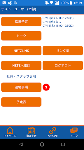指導予定や連絡事項、トーク機能などが利用出来ます。