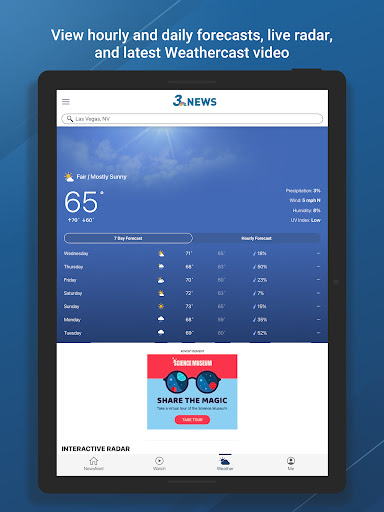 The News3LV KSNV Las Vegas News app delivers news, weather and sports in an instant. With the new and fully redesigned app you can watch live newscasts, get up-to-the minute local and national news, weather and traffic conditions and stay informed via notifications alerting you to breaking news and local events. • Breaking news alerts and stories • Live streaming • New weather section with hourly and daily forecasts • Live weather radar and traffic information • Completely overhauled app that is faster and easier to use
