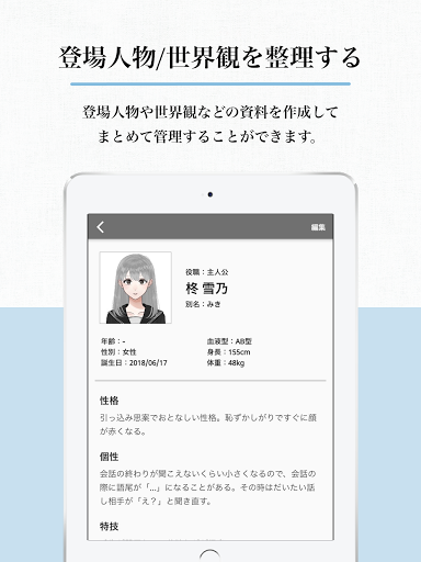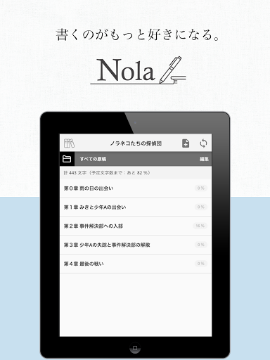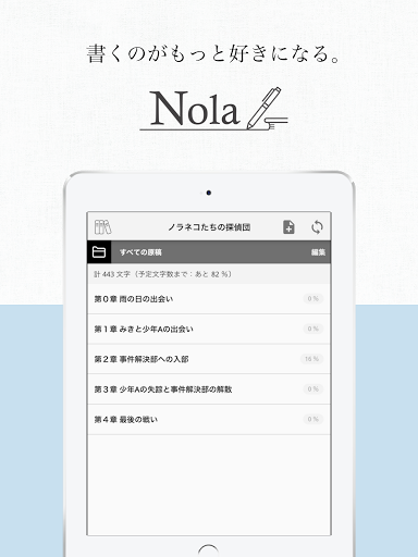 このアプリは、小説やマンガ、ゲームシナリオを含む下記のような作品を創作するときに最適なテキストエディタです。 ・小説(一般文芸、ライトノベルなど) ・コミック ・脚本(映画、演劇、アニメ、ドラマなど) ・TRPGのシナリオ プロットの作成や登場人物と相関図の管理など、文章の執筆に必要な機能を充実させています。 作品データの同期も【無料】でご利用いただけます。 ----------------------------------------------------------------------------------- ◉ Nola -ノラ- とは Nola -ノラ- は、小説のテーマ設定から物語のあらすじ、原稿の執筆、登場人物の保存までをサポートする作家専用のエディターツールです。 原稿の執筆のみならず、作家さんが1つの作品を書き上げる過程で考えられている「プロット」や「登場人物の設定」などもまとめて保存できるように開発しました。 まだまだ発展途上で未熟なツールですが、作家の皆さんからご意見いただきながら、楽しく描けるツールにできればと思いますので、何卒よろしくお願いします。 ----------------------------------------------------------------------------------- ◉ Nolaを使ってできること ⓪ データの保存・同期 Nolaで作成したデータはすべて、無料でクラウド上に保存しています。 機種変更をする際にも、アカウントにログインするだけでデータを同期することができるので、すぐに執筆や制作を再開できます。 また、PC版のNolaもございますので、スマホとPCの両方から作品を制作することができます。 ① テーマの設定 小説の「テーマ」と「ゴール」を記入し保存できます。 読者に届けたいテーマや物語の終着点を決めることで、小説の指針が定まりスムーズな執筆ができます。 ② プロットの作成 物語の骨格となるプロットの設定ができます。 プロットで大まかな流れを定めておくことで、あらすじをいつでも見直すことができ、ブレの少ないストーリー展開を書き上げやすくなります。 ③ 原稿の執筆 小説の原稿をクラウドに執筆・保存することができます。 原稿はクラウド管理しているので、Web版のNolaでPCとスマホの両方で執筆ができます。 アプリ版Nolaでは、オフラインでの執筆もできます。 ④ 登場人物/世界観など様々な資料の保存 小説に登場する人物や世界観、物語に出てくるアイテムなどのプロフィールや設定を保存しておくことができます。 キャラクターの人物設定や背景の描写に矛盾を生じることなく、原稿を書き上げられるサポートをできればと思っています。 ⑤ 相関関係・相関図の作成機能 作成した登場人物同士の関係性を書き留めたり、それを相関図として表示することができます。 相関図は複数作成することで、物語の流れに合わせて変化するキャラクター同士の関係性を書き留めることができます。 ⑥ 登場人物のイラスト作成機能 登場人物のイラストを顔など様々なパーツを選択することで作成することができます。 アバター感覚で自分の物語に登場するキャラクターのイラストを制作してみてください。 -----------------------------------------------------------------------------------