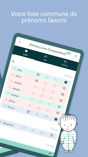 Je suis Charlie, l\intelligence artificielle de l\appli \CharliesNames\ ! Je vais vous aider, votre partenaire et vous, à trouver le prénom parfait pour votre bébé ! J\ai déjà aidé plus de 1 700 000 parents à trouver un prénom pour leur bébé ! Pourquoi pas vous aussi ? En vous connectant à votre partenaire via l\appli, vous pouvez voir immédiatement quels sont les prénoms que vous aimez tous deux. Et c\est là l\idée. Voici le contenu de la version gratuite * Profitez d\un vaste choix de 15 000 prénoms. * Précisez votre recherche grâce au filtre de genre (féminin/masculin/unisexe). * Invitez votre partenaire à se joindre à votre recherche du prénom parfait. * Identifiez immédiatement les prénoms que vous et votre partenaire aimez en comparant vos prénoms favoris. * Utilisez votre nom de famille et trouver un prénom qui lui correspond. * Ajoutez un deuxième prénom pour voir s\il passe bien avec le premier. * Ajoutez des prénoms qui manqueraient. * L\IA améliorée rend la recherche encore plus simple. * Consultez les classements des prénoms en Canada, France, Espagne, Portugal, Pays-Bas, Allemagne, Autriche, Suisse, Luxembourg, Suède, Finlande, Danemark, Norvège, USA, Royaume-Uni, Irlande, Australie, Nouvelle-Zélande... Contenu supplémentaire pour les utilisateurs de la version pro Aidez-nous et obtenez des fonctionnalités supplémentaires incroyables : * Filtrez des prénoms avec les premières et dernières lettres. * Excluez les premières et dernières lettres. * Recherchez par votre longueur de prénom préférée. * Pas de pub Vous aimez les prénoms qui commencent pas \L\ et se terminent par \a\ ? Les prénoms qui ne sont pas plus longs que 5 lettres et que votre partenaire aime aussi ? Ou vous avez juste besoin d\inspiration ? Alors CharliesNames est fait pour vous ! Téléchargez CharliesNames dès maintenant et amusez-vous tout en trouvant le prénom parfait pour votre bébé ! Si tu as des questions, problèmes ou feedback, merci de nous en faire part par email à hello@charlies-names.com