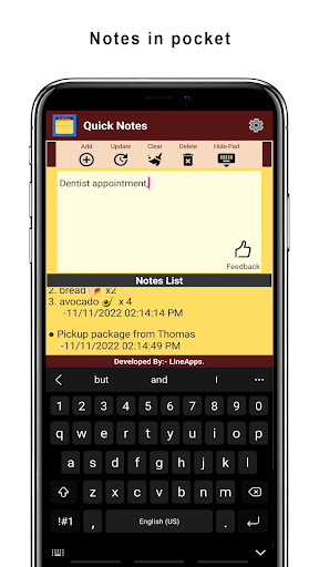 Notes rapides Caractéristiques :- * Facile à utiliser * Ajouter des notes instantanément * Prenez des notes de travail de bureau, d\école, de maison, etc., encore plus, * Sauvegardez vos notes, * Effacer les notes indésirables, * Voir les notes, * Date et heure des notes ajoutées, * Voir la liste de vos notes, * N\oublie jamais tes devoirs, Instantanément ne plus prendre de notes de votre travail, plus de gaspillage de papier, Vos notes et avis sont précieux pour nous ...,