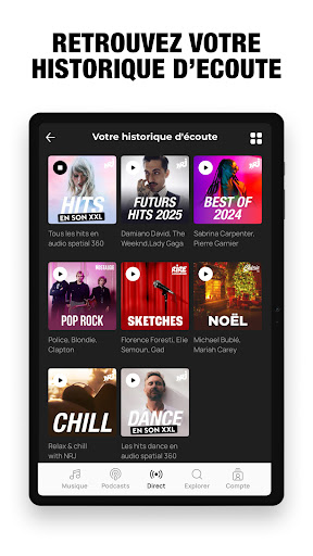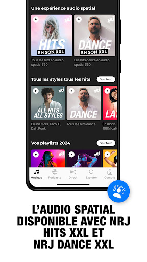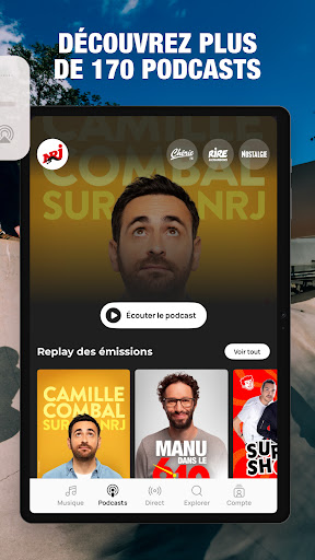 NRJ : UNE SEULE APP POUR ECOUTER 250 RADIOS, DES PLAYLISTS & PODCASTS EN EXCLU Découvrez l’application NRJ pour écouter gratuitement en ligne : radio, playlist, podcast et replay de vos émissions favorites ! Et retrouvez tous vos contenus préférés sans wifi en créant votre compte sur l’appli de musique NRJ. Directement depuis l’app NRJ, accédez aux 4 univers radios NRJ, Nostalgie, Chérie FM ou Rire & Chansons. Ecoutez aussi des centaines de webradio (playlist thème Humour, Zen, 80’s, Latino, Rap, RnB, Chanson française…), plus de 170 programmes podcasts dont de nombreuses créations originales et exclusivités ! En ce moment, rendez-vous sur la radio en ligne NRJ Hits XXL et NRJ Dance XXL pour vivre une nouvelle expérience unique en Son Audio Spatial ! APPLI NRJ : DE LA MUSIQUE GRATUITE EN QUALITÉ DIGITALE • NRJ, radio musicale N°1, vous offre tous les derniers tubes Pop, Electro, Dance, Rnb et Urbain en qualité digitale HD 576 kbps *. • Accès gratuit et en illimité à 250 Radios, des podcasts gratuits et à tous vos Hits musique préférés votre Smartphone, Tablette et dans votre voiture avec Android Auto. • Retrouvez en direct toutes vos émissions de radio préférées ! Suivez Manu dans le 6/10 (6h-10h), 1ère matinale de France, en Direct ou en Replay grâce aux podcasts des émissions. Tous les jours, entre 16h et 19h, écoutez Camille Combal et sa bande s’amuser de l’actualité du jour en compagnie d’invités surprise et jouez pour gagner des cadeaux ! • Retrouvez tous vos artistes favoris ! David Guetta, Ed Sheeran, Rosalia, Rihanna, Imagine Dragons, Maneskin, Bigflo et Oli, Miley Cyrus, Louane, Slimane, Harry Styles et tous les plus grands hits des stars internationales et françaises sont sur l’application mobile NRJ. LES FONCTIONNALITÉS DE L’APPLI NRJ RADIO & PODCAST • Création et connexion à votre compte NRJ pour gérer facilement vos contenus favoris et les écouter hors ligne. • Reprendre la lecture d’un podcast où vous l\aviez laissée grâce à la fonction de Reprise de lecture. • Ajoutez aux Favoris vos radios préférées et les podcasts qui vous intéressent pour ne rater aucun nouvel épisode ! • Téléchargement des épisodes podcasts en local sur votre appareil mobile ainsi que 30 minutes de certaines radios. • Géolocalisation pour écouter votre radio NRJ locale et tous vos podcasts locaux infos, actualités, humour... • Switcher de radio en appuyant sur le logo NRJ, Nostalgie, Chérie FM ou Rire & Chansons pour basculer automatiquement dans l\univers de cette radio (accès à l\ensemble du catalogue radios et podcasts NRJ Group). • Fonction \Réveil\ pour se réveiller avec NRJ ou une des 250 radios de votre choix. • Fonction \Veille\ pour s’endormir en musique ou avec un podcast. • Trouvez vos radios avec la fonction \Recherche\ depuis l\écran Explorer. • Retrouvez les titres diffusés durant les dernières 24h avec la fonction \C\est quoi ce titre ?\ depuis l\écran Explorer. Une suggestion, Une remarque, des difficultés avec l\App NRJ ? Contactez-nous via le formulaire disponible dans les préférences de l’app NRJ ou en cliquant sur « Assistance » dans l’onglet « Notes et Avis » de l’AppStore. Suivez votre radio NRJ sur les réseaux sociaux Facebook, Insta, Twitter, YouTube et TikTok ! -- * Précaution d’emploi : Attention, l\utilisation d\un réseau internet de données (3G/4G/5G/Wifi) peut engendrer des frais supplémentaires auprès de votre opérateur ou fournisseur d\accès, dont le groupe NRJ se décharge de toute responsabilité. Soyez attentif à votre consommation de données si vous disposez d\un forfait limité ou non adapté au Streaming. Dans le doute, nous vous invitons à vous rapprocher de votre opérateur ou fournisseur d\accès. Attention, sur Android 6.x et plus particulièrement sur les modèles Samsung, le mode économie d’énergie désactive toutes appli qui consommeraient de la data (3G/4G) lors de mise en veille.