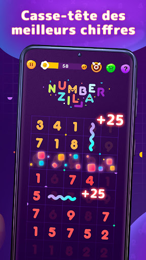 Des millions de personnes dans le monde entier adorent Numberzilla – le MEILLEUR jeu de chiffres ! Ce jeu de casse-têtes super addictif est le meilleur jeu cérébral de notre enfance avec de bonnes vieilles règles familières, est revenu avec un tout nouveau look spirituel. Les gens disent que cela améliore leur santé mentale et leur permet de se détendre, surtout après une journée de travail. Le casse-tête préféré Tu rencontreras notre jolie mascotte Numberzilla et ses amis - Croissmart, Avocat insolent, Guerrier pastèque, etc. Ils se feront un plaisir de te guider à travers les règles et garderont trace de tes résultats et exploits. Tu recevras des badges amusants avec des personnages qui te permettront de battre des records de temps, de collecter des points de jeu et de terminer les jeux. Nous te l\avions bien dit, Numberzilla se démarque vraiment des autres jeux de logique et de maths ! Comment y jouer ? La logique est simple ! • Barrez les paires des mêmes nombres (4-4, 2-2, 9-9) ou celles dont la somme est égale à 10 (2-8, 3-7 etc.). Deux nombres peuvent être supprimés en les touchant un par un. • Dans le jeu de puzzle Numberzilla, les paires doivent être placées côte à côte et vous pouvez les barrer verticalement, horizontalement et aussi lorsqu\un numéro est placé sur la dernière cellule de la ligne et un autre sur la première cellule de la ligne suivante du la grille. Il peut aussi y avoir des cellules vides entre les 2 nombres. • Le but est de barrer tous les numéros pour vider le tableau. • Lorsqu\il n\y a plus de numéros à supprimer, les numéros restants peuvent être ajoutés à la fin. Nous proposons 3 modes : ️1) Mode de puzzle de nombres classique : Il s\agit d\un mode « sans fin » : vous disposez d\un temps et d\un champ illimités pour établir un record de score ! Si vous manquez de mouvements, ajoutez simplement des lignes supplémentaires en bas. 2) Mode Survie : Le champ est limité, et les nombres chutent comme dans le jeu « Tetris ». Une fois que la planche est pleine — vous perdez ! 3) Mode Dynamique: Une fois que vous avez atteint le nombre maximum de numéros — vous pourrez les mélanger. Allez-y et vous passerez au niveau suivant ! Défis quotidiens et cadeaux Pour encore plus de divertissement, nous avons préparé quelque chose de spécial pour vous. Devinez le code du défi quotidien. Devinez le code chiffré, craquez le coffre-fort et gagnez des bonus quotidiens dans les nouveau jeux. Chaque jour, vous aurez un nouveau code de sécurité à deviner. Vous pouvez également obtenir des récompenses gratuites, des promotions intéressantes et des réductions dans notre jeu de strategie ! Popularité des jeux de puzzle de nombres Ce jeu est également connu sous le nom de Numberama, Take Ten ou 10 Seeds. La résolution d\un puzzle par jour te permettra d\exercer ta logique et tes compétences en mathématiques ! Essaie-le et profite du résultat ! Il y a 3 boosters dans le jeu : • Astuces : Utilisez les astuces pour simplifier le déroulement quand vous êtes bloqué • Bombes : Débarrassez-vous des nombres supplémentaires d’un seul coup • Échanges - Utilisez ce booster pour changer la position de deux chiffres choisis. Numberzilla Shop Visitez-le pour acheter des boosters quand vous en avez besoin, sans avoir à regarder les publicités pour obtenir des bonus. Cadeaux quotidiens Visitez le number game quotidiennement pour des récompenses gratuites et suivre les promos ! Inscrivez-vous à nos alertes pour en savoir plus ! Profite de l\accès Premium Numberzilla Tu peux vraiment jouer à Numberzilla gratuitement, mais avec l\accès Premium, nous te donnerons accès à un tout autre niveau : Débloquez un nombre illimité d\astuces, d\échanges et de bombes. Aucune publicité n\interrompra jamais la résolution du puzzle.