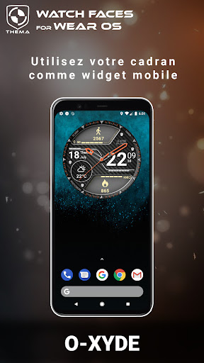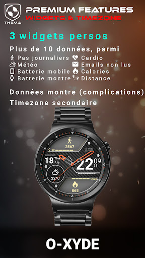 O-Xyde Watch Face pour Wear OS ! Vous n\avez pas de montre Wear OS ? Vous pouvez malgré tout utiliser ce cadran comme widget d\horloge sur votre mobile ! ️PAS POUR SAMSUNG GEAR S2 / GEAR S3 !! (sous Tizen OS)️ Si vous en avez une, n\installez pas cette application. Pour trouver les applications compatibles avec votre montre, ainsi que du support, allez sur http://www.themaapps.com/watch_on_tizen_os ★ Fonctionnalités de Oxyde Watch Face ★ - Widget d\horloge (Seconde non affiché pour raison d\autonomie de batterie) - Choix de couleur du design - Jour & Mois - Batterie de la montre - Batterie du téléphone - Météo (nécessite l\appli mobile) Les réglages du cadran sont situés dans l\application \Wear OS\. Touchez simplement l\icone crantée affichée sur l\aperçu du cadran pour accéder à l\écran de réglage ! ★ Réglages FREE ★ - Choix de couleur du design sur la montre et le téléphone - Délai de rafraichissement de la fréquence cardiaque - Délai de rafraichissement de la météo - Unité de température - Mode 12 / 24 heures - Définition de la durée du mode interactif - Choix entre les notifications Wear petites/grandes/transparentes/opaques - Choix de la luminosité du mode ambiant n&b et éco - Choix parmi 2 fournisseurs de météo (Yr & OpenWeatherMap) - Choix d\avoir un zéro sur les heures - Choix d\afficher ou non les points représentant les secondes ★ Réglages PREMIUM ★ - Choix du mode ambiant : éco, simple n&b, complet - Choix du fond parmi les différents styles - Coloration du fond dynamique - Choix de votre propre nom au lieu de O-XYDE - Définition d\une seconde timezone pour l\affichage digital - Data: + Choix de l\indicateur à afficher sur les 3 emplacements + Choix parmi 8 indicateurs (Compteur de pas journalier, Fréquence cardiaque, E mail de Gmail non lus, etc...) + Complication (wear 2.0) - Interactivités + Accès à un écran de données détailles pour chaque donnée disponible + Modification par simple touché de la donnée affichée parmi les 8 données disponibles. + Choix du raccourcis à afficher sur les 4 emplacements + Choix du raccourcis parmi l\ensemble des applications installées sur votre montre! + Choix d\afficher les zones interactives - Gestionnaire de préréglages: + Sauver votre préréglage avec toutes ses options (couleurs, fonds, données, fonctionnalités. TOUT est sauvé!) + Charger / Supprimer l\un de vos préréglages précédemment sauvés + Partager / Importer des préréglages - Définition manuelle ou automatique de la position ★ Installation ★ Watch Face Wear OS 1.X Ce cadran sera installée automatiquement sur votre montre via votre téléphone appairé. Néanmoins, si ce n\était pas le cas, lancer l\application Wear OS et aller dans les Réglages, puis appuyez sur \Resynchroniser les applications\. Wear OS 2.X Une notification sera affichée sur votre montre suite à l\installation mobile. Il vous suffira de l\utiliser pour démarrer l\installation du cadran. Si toutefois la notification n\avait pas été affichée, vous pouvez toujours installer le cadran en utilisant le Google Play Store disponible sur votre montre, en le recherchant par son nom. Widget mobile Il vous suffira d\effectuer un appui long sur l\écran de votre mobile, puis de sélectionner le widget correspondant au cadran pour le placer sur l\écran de votre mobile. Effectuez les réglages du widget en utilisant l\application. ** Si vous rencontrez des problèmes ou souhaitez simplement poser une question, n\hésitez pas à me contacter par mail (Anglais ou Français) avant de mettre une mauvaise note à l\appli :) Merci ! Website: http://www.themaapps.com/ Youtube: https://youtube.com/ThomasHemetri Twitter: https://twitter.com/ThomasHemetri Instagram: https://www.instagram.com/thema_watchfaces