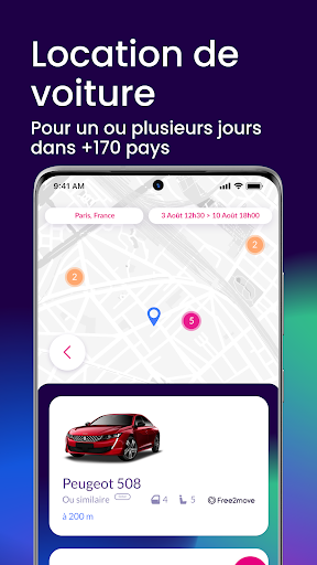 Avec une présence dans 170 pays et des millions d\utilisateurs actifs, Free2move simplifie votre mobilité au quotidien : Carsharing “location à la minute”, location (rent) de voiture pour quelques jours ou semaines, abonnement automobile ou encore réservation de parkings. AUTO PARTAGE : : Besoin de vous déplacer en ville à tout moment? Trouvez facilement une voiture à proximité en un simple clic dans l\application Share Now. Free2move et Share Now ont uni leurs efforts pour vous offrir une expérience de mobilité unique, et désormais, les services de carsharing sont facilment accessibles via l\application Share Now! Choisissez de partager une voiture avec une location en libre-service pour quelques minutes, quelques heures, une journée ou jusqu\à 30 jours. Avec l\application Share Now, localisez une voiture près de chez vous, déverrouillez-la, roulez et garez-vous sur l\aire de service: le stationnement est gratuit avec Free2move! Découvrez nos nouvelles voitures 100% électriques à Paris: Fiat 500e et Peugeot e208. Le service de mobilité Free2move est disponible à Washington (DC) ! Voitures neuves et 100% électriques à Paris : Fiat 500e, Peugeot e208 dans Share Now ! LOCATION DE VOITURE : : Besoin de louer une voiture pour un week-end ou plus ? Choisissez le véhicule et la durée adaptés à vos besoins. Free2move offre une solution flexible de location de voiture d\un jour à un mois avec une large gamme de véhicules récents disponibles dans les aéroports et points de vente des marques Peugeot, Citroën, DS Automobiles, Opel. Retrouvez également les offres Free2move sur Hertz, Avis ou encore Sixt. CAR ON DEMAND : : Free2move et son abonnement automobile moyenne durée vous propose une large gamme de véhicules neufs. Disponible immédiatement et jusqu\à 24 mois renouvelable, vous trouverez la voiture qui correspond le mieux à vos besoins (citadines, compactes, routières…). -Meilleure alternative à l’achat ou à la location longue durée. -Livraison de la voiture au lieu de votre choix. -Assurance tous risques, entretien complet, maintenance et assistance. PARKING: Vous recherchez un parking dans les gares, aéroports et centre-villes ? L\application Free2move vous permet de trouver une place de parking où vous le souhaitez partout dans le monde. Et cela au meilleur prix ! Trouvez votre emplacement de parking idéal parmi 500 000 places disponibles dans 65 pays. -Des parkings partout où vous le souhaitez : aéroports, ports, centres-villes et gares. -Des parkings sécurisés 24h/24 et 7j/7, incluant les parkings officiels des aéroports. -Réservez facilement votre place de parking à l’avance ou au dernier moment.