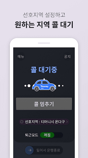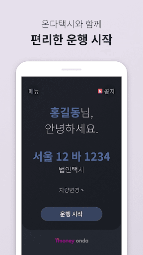 부르면 오는 착한 택시 “티머니onda 기사님용” 티머니onda는 착한 기사님들과 언제나 함께합니다. 티머니onda에서 안전하고 편리한 운행 시작하세요. [주요 기능] ■ 티머니onda 기사님 회원가입 - 티머니onda 기사님용 앱을 통해 가입 신청하실 수 있으며, 관리자 확인 후 가입 승인됩니다. - 택시운전자격증명 사진 등록, 계좌등록, 교육이수는 필수입니다. - 가입이 어려우신 경우 고객센터(1644-0635)로 문의하세요. ■ 승객 콜 받기 - “콜 대기중” 상태에서 콜을 받으실 수 있습니다. - 콜 배차 시, 기사님이 승객으로부터 가장 가까운 차량으로 판단된 경우입니다. 꼭 “콜 수락” 해주세요! - 콜 수행 시, 미터기 연동 지역은 미터기 정보를 확인하여 목적지 길안내와 결제단계로 자동으로 진행됩니다. ■ 지정배차 - 티머니onda는 미터기 연동 지역의 경우 차량의 미터기 정보를 확인하여 빈차인 경우 배차합니다. - 티머니onda는 승객으로부터 반경 1km 이내에 있는 차량 중 소통정보를 고려하여 가장 최적의 차량에게 지정배차 합니다. (“소중한 온다콜~”) ■ 자동결제 - “자동결제콜”의 경우 미터기 연동 지역은 목적지 도착 후, 미터기에서 지불버튼을 누르면 결제기 또는 스마트폰으로 운행요금이 자동으로 전달됩니다. (통행요금, 추가요금은 입력 필요하며 미터기 미연동 지역은 운행요금 입력 필요) - “자동결제” 버튼을 꼭 눌러주세요! ■ 운행이력 - 기사님이 운행 완료한 건수 및 상세 내역을 기간별로 확인하실 수 있습니다. ■ 교육영상 - 공지사항/이벤트/교육영상 메뉴에서 언제든지 티머니onda 사용법 교육영상을 시청하실 수 있습니다. ■ 마일리지 입금내역 - 메뉴에서 마일리지 입금내역을 확인하실 수 있으며, 지급 계좌정보를 변경하실 수 있습니다. ■ 1:1 문의 - 문의하기 탭에서 문의를 등록하고, 답변이 완료되면 문의내역에서 내용을 확인하실 수 있습니다. [앱 접근권한 안내] ■ 사용자는 원활한 이용을 위해 아래의 필수 접근 권한을 허용할 수 있습니다. 1. 위치: 배차 및 길 안내에 필요한 위치 정보 수집 2. 전화: 회원 인증 및 승객에게 전화 걸기 3. SMS: 승객에게 문자메시지 발송 4. 저장장치: 운행이력을 휴대폰에 저장하기 5. 다른 앱 위에 그리기: 다른 앱 사용 중에 콜 수신 및 길 안내 6. 카메라: 택시운전자격증명 촬영 7. 블루투스: 차량과 연결(블루투스 서비스 지역만 해당) 8. 포그라운드 서비스 권한: 콜 정보 수신 및 내비게이션 사용 [이용 문의 안내] ■ 고객센터: 1644-0635(상담가능시간: 평일 09시~18시, 점심시간 12~13시 제외) ■ 메일: ondataxi@tmoney.co.kr [카테고리] (애플리케이션 유형) 애플리케이션 (카테고리) 지도/내비게이션 (개발자 연락처) • 웹 사이트 : https://tmoney.co.kr • 이메일 : ondataxi@tmoney.co.kr • 주소: 서울특별시 중구 후암로 110 서울시티타워 12층 • 개인정보처리방침 : https://taxi.tmoneymobility.co.kr/taxigd/tmnyOndaStpl