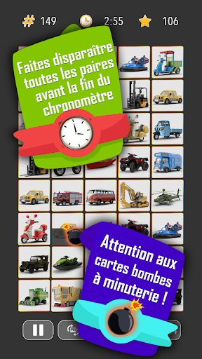 ONNECT est un JEU DE PAIRES à relier avec des niveaux difficiles. Trouvez les bonnes tuiles, reliez les paires avec 3 lignes au maximum. Faites disparaître toutes les paires avant la fin du chronomètre. Devenez un expert niveau après niveau. Profitez des collections d’animaux adorables, de fruits délicieux, de professions passionnantes, d’émoticônes plein d’enthousiasme et plus encore. CARACTERISTIQUES DU JEU Des niveaux difficiles et bien conçus Modes arcade et loisir Astuce et bonus de mélange Bonus de score en jeu Mouvements de tuiles Niveaux avec bombes minutées Nouvel essai après un échec Différentes collections d’images Mécaniques de jeux « onet connect » classiques Améliore la mémoire, la concentration et l’attention. AUCUNE PUBLICITES: l\achat d\un forfait supprime la bannière et les annonces interstitielles. POLIE: Car, contient de multiples effets visuels satisfaisants et stimulants. DANS VOTRE LANGUE. L’application est disponible en française ainsi qu’en arabe, chinoise, anglaise, allemande, italienne, japonaise, coréenne, portugaise, russe, espagnole, turque et vietnamienne. COMMENT JOUER ? L’objectif est d’ENLEVER TOUTES LES TUILES avant la fin du chronomètre. Trouvez DES IMAGES IDENTIQUES et appuyez dessus pour les relier. Les tuiles peuvent être reliées avec 3 LIGNES DROITES maximum quand il n’y a pas d’autres tuiles qui bloquent le chemin. Utilisez le bouton ASTUCE pour révéler une paire que vous pouvez relier. Utilisez le bouton MELANGE pour mélanger les tuiles. Vous pouvez éteindre le MODE ARCADE pour permettre aux plus jeunes de jouer. « Onnect » est le jeu le plus coloré et le plus pétillant de tous les puzzles gratuits, en particulier ceux qui possèdent des mécaniques de jeu ONECT CONNECT. Ils peuvent également servir de TEST D’ATTENTION. Tout le monde, quel que soit son âge, peut résoudre des énigmes stimulantes et énigmatiques.