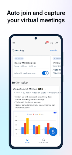Ne prenez plus jamais de notes de réunion. OtterPilot vos réunions avec l’IA. Obtenez un assistant de réunion qui enregistre l’audio, prend des notes, capture automatiquement les diapositives et génère des résumés. L’interface de l’application est actuellement disponible uniquement en anglais, mais elle prend en charge l’enregistrement et la transcription en français. Condensez une réunion d’une heure en 30 secondes. Otter transcrit toutes vos réunions, entretiens, conférences et conversations quotidiennes en temps réel. Obtenez des notes automatisées pour les réunions en personne, Zoom, Google Meet et Microsoft Teams. Otter.ai est également disponible sur le web. FONCTIONNALITÉS CLÉS ★ Assistant de réunion IA : obtenez des notes et des résumés de réunion automatisés ★ Chat IA : obtenez des réponses et rédigez des e-mails ★ Canaux IA : chat instantané sur différents canaux ★ Enregistrez & transcrivez en direct ★ Partagez & collaborez ★ Toutes les notes sont consultables & partageables ★ Modifiez & mettez en évidence ★ Organisez & exportez ★ Importez & synchronisez De Nombreuses Utilisations ★ Gagnez du temps - prise de notes automatique ★ Maintenez l’équipe synchronisée - partagez des notes et des tâches à accomplir ★ Enregistrez et transcrivez des entretiens, conférences, podcasts, vidéos, webinaires, discours ★ Fournissez des sous-titres en direct aux communautés sourdes et malentendantes et à toute personne ayant des besoins d’accessibilité Enregistrez & Transcrivez en Direct ★ Enregistrez instantanément en un seul tap, avec un widget et un raccourci ★ Transcription en temps réel (en ligne) avec haute précision ★ Prise de notes automatique ★ Mettez en évidence les points clés à revoir plus tard ★ Insérez des photos de discussions au tableau blanc, diapositives, etc. ★ Revenez en arrière pour saisir une citation ou revoir un point ★ Entrez l’audio via le micro intégré ou un appareil Bluetooth Enrichissez les Notes avec l’IA ★ Ponctuation, capitalisation, et paragraphe automatique ★ Identification des intervenants (après un peu d’entraînement) ★ Génération de mots-clés résumés ; touchez un mot pour aller là où il a été dit ★ Capture automatique des diapositives lors des réunions virtuelles ★ Résumé automatique après toutes les réunions d’équipe Partagez & Collaborez ★ Commencez un enregistrement dans un groupe pour partager la transcription en direct ★ Invitez des membres de l’équipe à consulter, modifier et mettre en évidence en collaboration. Toutes les mises en évidence seront capturées dans le panneau Récapitulatif. ★ Dans le panneau Récapitulatif, ajoutez des commentaires & attribuez des tâches ★ Partagez par lien externe Recherche & Lecture ★ Recherchez le texte pour éviter de devoir écouter tout l’audio ★ Lecture à vitesses ajustables ★ Suivez le mot mis en évidence pendant la lecture de l’audio Organisation & Exportation ★ Organisez vos conversations dans des dossiers personnels ★ Copiez dans le presse-papier, ou partagez directement dans d’autres applications ★ Exportez le texte en PDF, TXT, ou SRT ★ Exportez l’audio en MP3 Importation & Synchronisation ★ Importez de l’audio (aac, m4a, mp3, wav, wma) et de la vidéo (avi, mov, mp4, mpg, wmv) ★ Téléchargez à partir de Call Recorder - ACR ou d’autres applications d’enregistrement d’appels ★ Synchronisez avec vos calendriers pour obtenir des rappels pour enregistrer vos réunions et auto-titrez vos notes Exigences ※ Android 6.0 & plus ※ Connexion Internet pour la transcription ※ Vous devez créer un compte pour profiter d’Otter. Consultez nos Conditions d’utilisation : otter.ai/terms-of-service Nous prenons la sécurité et la confidentialité très au sérieux. Vos données sont confidentielles avec Otter. Nous ne vendons ni ne partageons vos données avec des tiers. Vous avez le contrôle total pour supprimer vos données de manière permanente. En savoir plus sur https://otter.ai/privacy Contactez-Nous Assistance : https://help.otter.ai X (Twitter) : @otter_ai