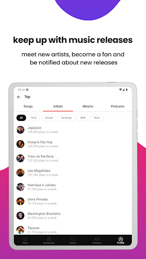 With Palco MP3, you discover new Brazilian music for real! You know when you\re tired of listening to the same songs? Well, with Palco, you think outside the box and listen to music, no matter your style. For over 18 years, we have been promoting artists in the music industry and creating playlists for every moment of your day. With Palco, you\ll be in the know before everyone else. Pretty cool, right? Here you\ll find over 60 music genres with many new Brazilian artists, and you can customize the app however you want. Not to mention the best podcasts to download and listen to whenever you want. If you\re an artist, Palco MP3 takes your music further. We specialize in discovering new talents that will conquer Brazil. Access palcomp3.com/cadastro.htm, create your free account, submit your original music, and receive complete promotion options. Library | Listen and download thousands of songs for free on your phone Feeling bored with music? On Palco, you\ll find over 1.6 million songs, 138,000 active artists, and 60 original playlists with hand-picked songs by us. Or you can create your own and set the soundtrack for the day. Favorite albums, artists, songs, podcasts, and playlists. Made for you | Personalize your home screen When you download the Palco app for the first time, you choose your favorite music genres, and we take care of the rest! We create a home page based on what you love the most, with music recommendations, albums, artists, music videos, and even podcasts. Whether you\re a fan of funk, pop, forró, hiphop/rap, trap, MPB, gospel, piseiro, sertanejo, rock, indie, arrocha, axé, or any other style. Stories | Exclusive artist content in your app With Palco\s stories, you get the latest updates from the artists you love firsthand. Don\t miss out on behind-the-scenes moments or the latest music to arrive on the app. Liked the sound? Swipe up and listen instantly! Podcasts | Listen to your favorites Filter the best podcasts by genre and download them to listen whenever you want. Don\t miss a thing! Favorite your preferred podcasts and receive notifications of new episodes. We are constantly updating our app to provide a better musical experience! Connect with Palco MP3: Instagram: https://www.instagram.com/palcomp3 Twitter: https://twitter.com/palcomp3 Palco MP3 Blog: https://blog.palcomp3.com Facebook: https://www.facebook.com/palcomp3 Palco MP3 Blog: https://blog.palcomp3.com TikTok: https://www.tiktok.com/@palcomp3 Youtube: https://www.youtube.com/c/palcomp3 Need help? Contact our team, we\ll be happy to assist you! contato@palcomp3.com