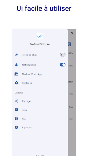 Lisez-vous les messages avec notifications pour éviter que les autres sachent que vous avez lu leurs messages ? Si vous ne voulez pas que les autres sachent que vous avez lu leurs messages, cette application est faite pour vous. Enfin.. il n\y a pas de coche bleue.. vous pouvez lire les messages sans y répondre maintenant. Lorsque vous recevez un message d\une application de chat, il sera également affiché dans NoBlueTick. Là, vous pouvez le lire quand vous voulez, sans qu\aucun de vos amis ne sache que vous l\avez vu. Tous les messages supprimés de WhatsApp, Messenger, Viber, etc. sont enregistrés dans NoBlueTick, ce qui vous permet d\obtenir secrètement les messages importants et de n\en perdre aucun. Ne vous embêtez plus à supprimer la connexion Internet ou à activer le mode Airplan. NoBlueTick offre un design simple mais beau et facilite la gestion de vos messages. NoBlueTick n\accède à aucun fichier crypté. Toutes les données sont stockées en toute sécurité sur votre appareil. NoBlueTick a également des bulles de discussion qui vous montreront les messages non lus dans une petite bulle à l\écran. Ceci est très utile car il vous donne la possibilité de lire les messages sans avoir à arrêter vos tâches en cours. Appuyez simplement sur la bulle pour ouvrir le message sur NoBlueTick ou faites-le glisser vers le bas de l\écran pour le supprimer. Caractéristiques de l\application : Masquer la double coche bleue pour WhatsApp, dernière vue invisible pour Facebook Messenger, pas de dernière lecture pour Viber Lisez les messages de discussion de manière invisible et anonyme, sans que vos amis le sachent Tous vos chats préférés en un seul endroit, où vous pouvez les trier soigneusement par application Bulles de discussion pour un aperçu rapide des messages Activez ou désactivez NoBlueTick pour différentes applications de chat comme WhatsApp, Viber ou Messenger. Comment fonctionne l\application ? Les messages sont cryptés sur votre appareil afin que NoBlueTick ne puisse pas y accéder directement. La seule solution disponible consiste à les lire à partir des notifications que vous recevez et à créer une sauvegarde des messages en fonction de votre historique de notifications, ce que fait l\application. Obstacles à l\application : Veuillez noter qu\il n\existe aucun moyen officiel et approuvé de lire les messages de l\application de chat. Ceci est une solution de contournement et peut avoir des limitations en raison de l\application de messagerie spécifique ou même du système d\exploitation Android : 1) Les SMS sont enregistrés via vos notifications, donc, si vous mettez un chat en silence, ou si vous consultez actuellement un message sur l\application de messagerie, vous ne recevrez pas de notification et NoBlueTick ne pourra pas l\enregistrer ! Cela signifie évidemment aussi qu\il est impossible d\afficher des notifications/messages avant de télécharger cette application (donc téléchargez-la vite !). 2) Si les messages ne sont pas enregistrés, il se peut que l\application soit tuée en améliorant les performances de la batterie. Veuillez supprimer NoBlueTick de tous les services d\optimisation de la batterie ! NB : NoBlueTick n\est en aucun cas affilié ou approuvé par Facebook, Messenger, WhatsApp ou Viber. Toutes les marques déposées affichées sur ces applications sont la propriété de leurs propriétaires respectifs. Si vous aimez l\application, évaluez-nous et demandez de nouvelles fonctionnalités si vous le souhaitez.. Aussi, écrivez-nous dès que vous rencontrez un problème avec l\application. Nous vous souhaitons une bonne journée !