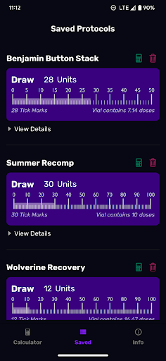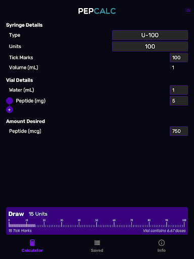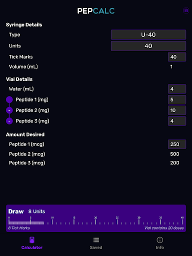 ** The #1 peptide reconstitution calculator app! As featured on leading podcasts including Ben Greenfield, Data Driven Radio, and more! ** PepCalc is the easiest, most accurate way to calculate peptide reconstitution amounts in each unit or tick mark. Features: • Fully configurable inputs: Input volume, units, tick marks, quantity of peptide(s), volume of sterile or bacteriostatic water, and desired amount • Instrument type selection: Choose between U100 and U40 and PepCalc will automatically set the correct volume, or choose “other” for complete control of the inputs • SUPPORTS MULTI-PEPTIDE BLENDS: Working with a peptide blend? Optionally add additional peptides and PepCalc will compute all amounts • Saved protocols with notes: Name and save your favorite peptide reconstitution calculations for easy recall, including notes. No more unnecessary retyping! • Dark mode support • No signup required and no ads!
