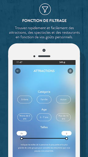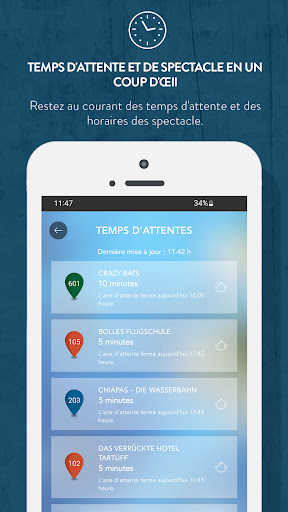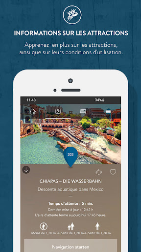 Découvrez VOTRE Phantasialand : préparez votre visite depuis chez vous et trouvez facilement vos attractions préférées une fois sur place. Vous souhaitez explorer nos mondes fantastiques avec vos enfants ? Vous êtes prêt à ressentir des sensations fortes sur les meilleures attractions d’Europe ? Ou vous préférez vous émerveiller devant nos magnifiques spectacles en live ? L’application Phantasialand est votre compagnon interactif idéal ! L’application Phantasialand : aussi unique que vous ! - Utilisez la carte interactive pour une expérience personnalisée, gardez une vue d’ensemble et trouvez le chemin le plus rapide vers vos endroits préférés. - Consultez les temps d’attente en temps réel et recevez une notification lorsque votre attraction préférée est plus accessible. - Ne manquez aucun spectacle : l’application Phantasialand vous rappelle les horaires pour que vous ne ratiez rien. - Informez-vous sur nos trois hôtels d’exception : Charles Lindbergh, Matamba et Ling Bao. - Planifiez votre voyage culinaire à travers Phantasialand et découvrez les spécialités faites maison proposées dans nos restaurants du parc et des hôtels. - Découvrez Fantissima, le dîner-spectacle le plus célèbre d’Allemagne ! - Restez informé de tout : tarifs, horaires d’ouverture et informations d’accès.