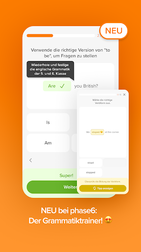 Lernen, das im Kopf bleibt: Bereite dich mit phase6, dem intelligenten Vokabeltrainer, optimal auf deinen nächsten Vokabeltest vor. Unser Ansatz kombiniert wissenschaftliche Methoden mit Spaß beim Lernen, um dir zu helfen, Vokabeln schneller und effektiver zu lernen. Praktischer geht’s nicht: Lerne Vokabeln, wie sie im Schulbuch stehen: Finde Vokabelsammlungen für alle bekannten Schulbücher von Verlagen wie Klett, Cornelsen, C.C. Buchner, PONS uvm! Ob Vokabeln zu Green Line, Découvertes, À Plus!, Go Ahead, Lighthouse, Campus uvm – wir haben sie (fast) alle . So lernst du genau die Vokabeln, die gerade im Unterricht behandelt werden . Bei über 1.300 Vokabelsammlungen ist dein Schulbuch bestimmt auch dabei. Ausgezeichnete Lernmethode: Nutze einen Vokabeltrainer, der von über 11.000 Lehrkräften unterstützt wird und bewährte Lernerfolge vorweisen kann. Mit phase6 lernst du nicht nur, sondern verankerst Vokabeln nachhaltig im Langzeitgedächtnis. Studienergebnisse des Unternehmens hopp Marktforschung von 2023 belegen: über 87% verbessern ihre Noten, 98% empfehlen uns weiter. Neu: Der Grammatiktrainer von phase6: Dein Begleiter für die englische Grammatik. Wiederhole und festige die Grammatik der 5. + 6. Klasse. Übe mit Vokabeln, die du kennst, und trainiere mit themenbezogenen Übungen. Unsere KI gibt dir individuelles Feedback, damit du auch schwierige Themen meisterst. Deine Vokabeln, dein Tempo: Unsere App passt sich deinem individuellen Lernfortschritt an, um sicherzustellen, dass du stressfrei und ohne Überforderung lernen kannst. phase6 wiederholt die Vokabeln dabei in größer werdenden Abständen und solange, bis sie auch wirklich sitzen. Alles für deinen Spracherfolg: Über 1.300 Vokabelsammlungen: Exakt abgestimmt auf dein Schulbuch Wissenschaftlich fundiertes Lernen: Behalte Vokabeln nachhaltig im Kopf Motivierende Lernstatistik: Dokumentiere und feiere deinen Erfolg Lerne überall, online und offline: Zuhause oder unterwegs Voll fokussiert: Eine werbefreie Umgebung sorgt für ungestörtes Lernen Wähle deinen Weg zum Erfolg: Egal ob am PC, auf deinem Windows-Tablet, Android- oder iOS-Gerät – mit phase6 hast du die Freiheit, überall und jederzeit Vokabeln zu lernen. Du kannst den phase6 Vokabel- und Grammatiktrainer in vollem Umfang für 7 Tage kostenlos und unverbindlich testen. Für mehr Informationen und Tipps zum Sprachenlernen, besuche uns auf [www.phase-6.de](http://www.phase-6.de/)