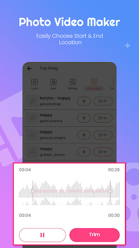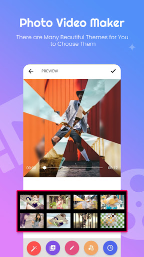 This is a best app to make video of your own photo with music you want. Photo Video Maker with Music app helps you to create fast and awesome slideshow with selected photos and music. Arrange or set the photo in order with the perfect background, music and animation to create a beautiful video stories. This is a beautiful Video Maker App from photo to impress your loved one by creating stories of your love and show them how much you love them !!! How to use this Photo Video Maker With Song app : CREATE PROFESSIONAL LOOK VIDEOS - Just select photos form gallery, Add music and your video is ready. STUNNING ANIMATIONS ARE ON JUST ONE CLICK - Photo slideshow with music app have lots of stunning 2D & 3D animations for creating professional videos. - To create movie photo slideshow with music supports various animations, like * Diamond Out * Open Door * Close Door * Eclipse * Circle Right Bottom * Skew Left Close * Circle Left Up ADD YOUR FAVORITE MUSIC TRACK - Photo Video maker with music provides a trimming option for particular audio track. So you can add your loved one music track to video slideshow. MAKE VIDEOS IN ANY OCCASIONS - You can create video story in any occasion like Birthday celebration video, Picnic video, Marriage video, Love video, Anniversary video, Party video, Funny video, Festival video, New year video, etc with the use of photo video maker with music app. INSTANT VIDEO PREVIEW - You can see preview of slideshow with music before creating video. FASTEST VIDEO MAKING - You can apply animation, photo video filter, set time of slide show (Fast/Slow), add frames and create video fast and smoothly. SHARE WITH FRIENDS & FAMILY - You can share created videos to your friends, family or loved one via Social media like, Whatsapp, Instagram, Facebook or any social network. Hope you will love this Photo Video Maker With Music app and don\t forgate to give good rating if you like it so much. Please write us your suggestion and feedback to make this app more wonderful. We appreciate your suggestions & feedback. We will consider them and will try to give you best application which will be more convenient for you. Thank you...