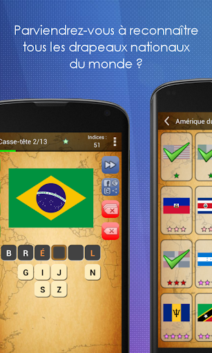 Bien sûr, on reconnaît un pays à son drapeau. Mais avez-vous jamais vérifié combien de drapeau vous savez reconnaître, en réalité ? Pourriez-vous vraiment reconnaître tous les drapeaux du monde ? Après tout, il en existe des centaines ! Mettez à l\épreuve vos connaissances géopolitiques dans ce jeu addictif de questions-réponses ! Un jeu qui propose : • Des devinettes sur les drapeaux de quelque 194 pays du monde ; • 6 mondes ou « continents », chacun disposant de sa propre liste de devinettes ; • Un système de classement en ligne pour défier vos ami(e)s ; • De nombreux trophées à débloquer ; • Une difficulté progressive ; • Des indices à utiliser en cas de blocage pour révéler des lettres de la réponse ou des noms de villes importantes ; • Des statistiques détaillées sur vos progrès ; À noter d’ailleurs : • Son optimisation pour les appareils mobiles et les tablettes ; • Un poids léger pour un contenu massif ; • Le support des effets d\immersion tactile pour de meilleures sensations ; • La progression sauvegardée en ligne sur votre compte Google : débutez une partie sur le téléphone, continuez-la sur votre tablette ! • Une maniabilité simple : Passez d\une question à l\autre d\un mouvement de doigt ; • Un jeu *totalement* gratuit et qui le restera ; Avec ce jeu, découvrez de nouveaux pays, affinez vos connaissances, impressionnez vos amis, vos professeurs ou même vos collègues de travail. Jouez avec votre famille, amusez-vous et développez votre culture géographique ensemble. Certaines énigmes sont faciles et peuvent être résolues en un instant, mais d\autres pourraient bien s\avérer nettement plus corsées ! Avec Picture Quiz : Les Drapeaux, mettez à l’épreuve votre intellect, vos capacités de perception et votre mémoire. Et tout ceci, sur portable comme sur tablette ! Cet excellent jeu gratuit de questions-réponses sur les pays du monde vous occupera pendant des heures ! Vous bloquez sur une devinette ? Utilisez des indices pour vous aider à avancer ou utilisez Facebook, Google+ et autres réseaux sociaux pour la soumettre à vos ami(e)s. Trouvez la bonne réponse, devinez le pays derrière chaque drapeau, réussissez et remportez des trophées !