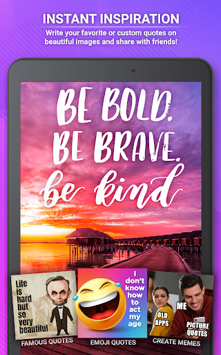 Picture Quotes is the best to convey message you want with Text on Photos with Various Textures, Colors, Fonts and shaders for the Text on Pictures. Picture Quotes to create photo text on images supports three types of images: 1. Photos from Your Gallery. 2. Various Categories of Photos Pre designed by for following Messages: a. Love Messages on Photos. b. Birthday Messages with Birthday Photo Backgrounds. c. Wedding Messages with Wedding Photo Backgrounds. d. Vacation Quotes with Vacation Photo Backgrounds. e. Friendship Quotes with Friends Photos. f. Family Quotes with Family Photos. g. Funny Quotes with Funny Photos. h. Famous Quotes with Famous people Photos and Famous Backgrounds. i. Jesus Quotes with Popular Quotes by Jesus Christ. j. Bible Quotes with Most Popular Quotes from Bible to add as Quotes to Photos. k. Inspirational Quotes with Famous Inspirational quotes on your photos. 3. Search web for Photos that you want as Photo Background for Your Photo Messages. Picture Quotes comes with Custom Messages by us or your can create your Quotes and Photo Sayings that can be added to Photos. Photo Quotes that are predesigned are in following Categories: 1. Love Quotes to appear on your photo backgrounds. 2. Wedding Wishes to appear on Photos. 3. Vacation Messages. 4. Birthday Wishes that are custom made to appear on photos. 4. Famous Quotes with Famous People. You can add Quotes by famous people like Donald Trump and their quotes on Famous People Pictures. 5. Picture Grid Quotes - New Feature to Add your Pictures to Picture Grids with Photo Quotes on the Picture Grids. 6. Emoji Quotes - New Feature to Add Quotes over Emoji Photos. We have tons of Emoji\s for you to add quotes to. 7. Meme Generator -- MEME Creator added lets you create MEME Quotes Pictures. This is Pro version only Feature. 8. Animated Quotes - Create Animated GIF with Quotes or Video Quotes with Text Animations and Animated Quotes. Picture Quotes is easy to use: 1. Select a Photo on which you want to add Photo Quotes. This photo can be from your gallery, Our Custom designed Photo Backgrounds for Messages or based on searching web for Photos. 2. Select one of Custom Photo Quotes or Create your own to appear on the Photo Background. 3. Add Color or Photo Texture to Photo. You can set Font and Style of the Text on Photo. 4. Meaningful photo quotes with gorgeous backgrounds.