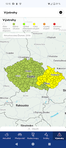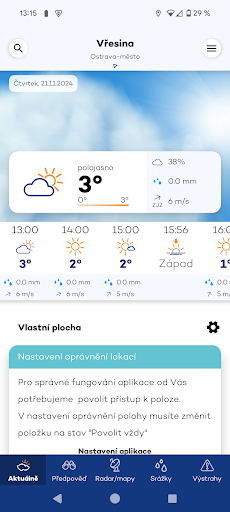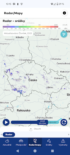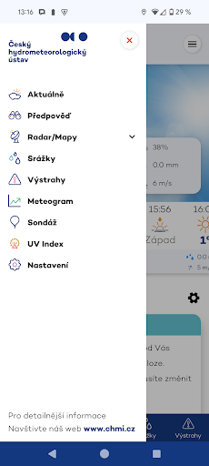 Aplikace ČHMÚ počasí je oficiální aplikací Českého hydrometeorologického ústavu (ČHMÚ), která poskytuje širokému spektru uživatelů obecné i detailní informace o aktuálním a očekávaném vývoji počasí, stavech vodních toků, úrovni znečištění ovzduší a další data z oboru zájmu ČHMÚ. Základní část aplikace tvoří předpověď počasí pro uživateli vybrané lokality nebo oblasti, a to jak ve formě grafických ikon, tak textové předpovědi. Nechybí detailní radarové snímky v 5minutovém kroku a předpověď srážek na nejbližší desítky hodin. Klíčovou součástí aplikace jsou také výstrahy. Aplikace zobrazuje aktuálně platné i nadcházející výstrahy na různé nebezpečné jevy. O těchto výstrahách je také uživatel informován prostřednictvím push notifikací ihned po jejich vydání v oblasti zájmu. V aplikaci nechybí ani další užitečné informace – například předpověď UV indexu, biometeorologická předpověď, odhad spadlých srážek, riziko přívalových povodní, informace o aktivitě klíšťat, sondážní data a další. Výchozí plochu aplikace si mohou uživatelé nastavit dle svých vlastních preferencí a zájmů tak, aby zobrazovala právě to, co potřebují. Výstupy jsou k dispozici formou tabelárních, grafických i mapových podkladů. Kromě výchozích notifikací na vydané výstrahy si uživatelé mohou nastavit vlastní, tzv. personalizované notifikace, kde si lze zvolit vlastní kritéria podle kterých jsou uživatelé aplikaci upozorňováni například na očekávaný déšť v konkrétní lokalitě ve vybraný čas, pokles či vzestup hladiny vybraného toku nebo třeba překročení určité hodnoty koncentrací prachových částic.