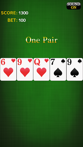 This app is a simple poker to play with ease. By all means, please try to play. ■ Rule When the user selects the Bet, five cards are dealt to the user. Playing cards were distributed can be replaced up to 2 times. If you want to replace the card, select the card you want to exchange, and then press the Draw button. If you want to game, and press the button Showdown. If you won the game,the score is added. If you lose the game, you lose score.