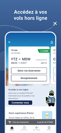 L’application de Porter est conçue pour vous aider tout au long de vos voyages. Gérez vos déplacements, enregistrez-vous et obtenez votre carte d’embarquement électronique ainsi que d’autres renseignements importants le jour de votre voyage. Votre assistant pratique est à portée de main. Enregistrement en déplacement Où que vous soyez, vous pouvez facilement vous enregistrer pour votre vol. Ajoutez un bagage, visualisez, modifiez ou surclassez votre siège, mettez à jour vos renseignements et évitez d’avoir à faire la file à l’aéroport ! Vos cartes d’embarquement sont sauvegardées pour que vous puissiez les utiliser hors ligne dans l’application. État du vol Vérifiez l’état de votre vol en recherchant l’itinéraire ou le numéro de vol. Vous verrez les détails de votre vol, comme les heures de départ et d’arrivée, les repos en escale et les mises à jour en temps opportun de l’état du vol. Notifications de vol pour rester au courant Il n’a jamais été aussi facile d’obtenir les renseignements les plus récents sur votre vol : activez simplement les notifications poussées mobiles pour recevoir des alertes de vol importantes en cas de retard ou d’annulation, et des rappels d’enregistrement. Sélection des sièges Que vous préfériez une place côté hublot ou côté allée, ou que vous souhaitiez profiter d’un grand espace pour vos jambes, vous pouvez maintenant choisir votre siège en un clic sur notre application. Ajout de bagages L’application vous permet d’ajouter facilement des bagages à votre réservation. Économisez temps et argent en réservant vos bagages supplémentaires; les frais de bagages sont moins élevés sur notre application qu’à l’aéroport. Gestion des déplacements En quelques clics, accédez à votre réservation et modifiez vos vols selon vos besoins. Consultez votre itinéraire et ajoutez facilement des bagages, choisissez votre siège ou enregistrez-vous pour votre vol. Accès hors ligne L\application Porter a été optimisée pour une utilisation hors ligne. Consultez les details de vos vols, vos cartes d\embarquement et plus encore, même sans accès à l’internet. Accès à VIPorter Inscrivez-vous ou connectez-vous à VIPorter pour profiter pleinement de notre application et des avantages du programme de fidélisation : gérez votre profil et consultez vos points, votre niveau de membre et d’autres renseignements relatifs à votre compte. En téléchargeant ou en mettant à jour cette application, vous acceptez que vos données personnelles soient traitées conformément à l’énoncé de politique de protection de la vie privée de Porter : https://www.flyporter.com/fr-ca/privacy.