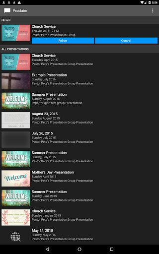 This remote app is the perfect compliment to Proclaim by Logos. It gives worship leaders, preachers, teachers, and other presenters even more access to the cutting edge features of Proclaim. Use the remote with your Proclaim desktop app to: - Control or follow along with On-Air presentations - View your notes as you present - Preview presentations - Play and pause video service items - Present straight from your mobile device to your TV or projector via Chromecast - And more More about Proclaim Proclaim is the first cloud-based church presentation software, bringing true collaboration to your ministry team: Access your presentation from any device with an internet connection Send signals to people who use the Faithlife Study Bible app and Logos’ Bible app Broadcast messages containing Bible verses, events, and even donation requests Plus, anyone with this app can follow along with On-Air presentations, seeing nearly everything that appears on the projection screen. This remote is exclusively for use with Proclaim and works in conjunction with both the Mac and Windows apps.