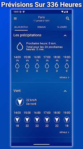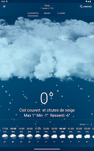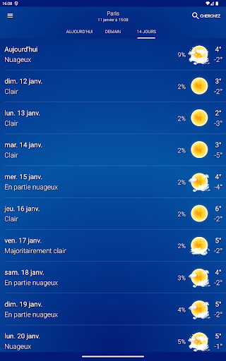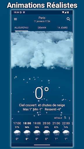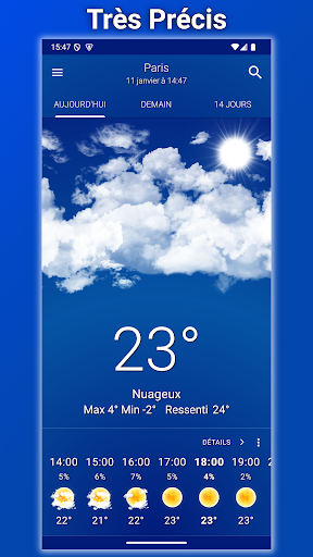 Si vous ne voulez pas être pris au dépourvu par la pluie, le froid ou les températures élevées, vous devriez essayer l\application de prévisions météorologiques Ciel Dégagé. L\application Ciel Dégagé offre des prévisions très précises, une interface facile à lire, des prévisions horaires sur 14 jours avec de nombreux détails sur les précipitations, le vent, la température et de superbes animations météorologiques. Pour garantir des prévisions météorologiques très précises, nous collaborons avec des tiers qui évaluent les prévisions des principaux fournisseurs météo par rapport aux conditions météorologiques réelles. Ce test rigoureux nous permet de choisir le fournisseur de météo le plus précis pour notre application. Fonctionnalités : - Prévisions Précises : Vous pouvez compter sur l\application Ciel Dégagé pour obtenir des prévisions précises et fiables. Nous sélectionnons le meilleur fournisseur de météo en testant rigoureusement l\exactitude des prévisions de différents fournisseurs. - Prévisions Horaires sur 14 Jours : Vous permet de choisir le jour et l\heure idéaux pour une randonnée ou de trouver le moment le plus approprié pour des vacances en famille en toute confiance. - Prévisions pour les Prochaines 2 Heures par Intervalle de 15 Minutes : Vous permet de voir la météo pour les deux prochaines heures dans des segments faciles à vérifier de 15 minutes. Par exemple, si vous planifiez une courte promenade, vous pouvez rapidement voir s\il va bientôt pleuvoir, ce qui vous aide à choisir le meilleur moment pour sortir. - Animations Magnifiques : Nos animations donnent vie à la météo directement sur votre écran. En vérifiant les prévisions, vous verrez tomber des gouttes de pluie, bouger des nuages et le soleil illuminer votre affichage, rendant la compréhension des conditions météorologiques actuelles et à venir facile et agréable. - Facile à Lire : L\application Ciel Dégagé assure que tout le monde peut facilement lire et comprendre les informations météorologiques. - Design Épuré : L\application Ciel Dégagé présente un design propre et non encombré, agréable pour les yeux et simple à naviguer. Cette mise en page élégante vous aide à trouver rapidement les informations météorologiques dont vous avez besoin, sans tracas. - Widgets : Obtenez un aperçu rapide de la météo avec les widgets faciles à utiliser de l\application Ciel Dégagé. Ils vous montrent la météo directement sur votre écran d\accueil, vous n\avez donc pas besoin d\ouvrir l\application pour savoir si vous avez besoin d\une veste. - Couverture Globale : Où que la vie vous mène, l\application Ciel Dégagé vous accompagne avec des prévisions météorologiques précises grâce à notre couverture mondiale étendue. - Prévisions Détaillées : Plongez dans les prévisions faciles à lire de l\application Ciel Dégagé couvrant tout ce que vous devez savoir, comme la vitesse du vent, l\humidité, et plus encore. Tout est là pour vous aider à mieux planifier votre journée. - Observations en Temps Réel : Utilisant des stations météorologiques, l\application Ciel Dégagé vous offre les mises à jour météorologiques les plus récentes pour que la pluie soudaine ou la chute des températures ne vous surprenne pas. Installez maintenant l\application Ciel Dégagé et découvrez un monde où suivre la météo est simple et amusant !