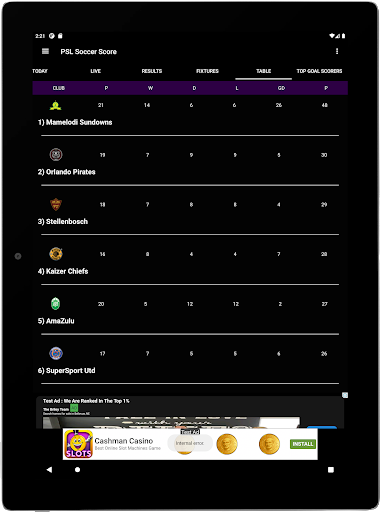 Stay up-to-date with the latest PSL Results, Fixtures, and Table logs... Mtn8, Nedbank Cup DStv Premiership Soccer League and Afcon Whether you follow : • Mamelodi Sundown • SuperSport Utd • Royal AM • Stellenbosch • Sekhukhune United • Golden Arrows • Orlando Pirates • Kaizer Chiefs • AmaZulu • Baroka • Maritzburg Utd • Cape Town City • Swallows • Chippa United • Marumo Galla
