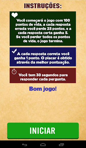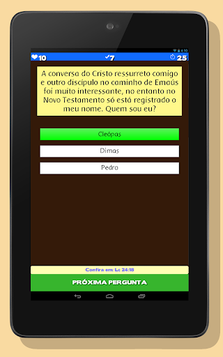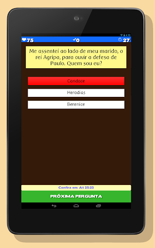 Aprenda mais sobre a Bíblia com esse divertido jogo de perguntas. Descubra quem é o personagem através das pistas que ele oferece a você em uma frase. O jogo conta atualmente com 725 perguntas. Você começará o jogo com 100 pontos de vida, a cada resposta errada você perde 25 pontos, e a cada resposta certa ganha 5. Se você perder todos os pontos de vida, o jogo termina. A cada resposta correta você ganha 1 ponto. O placar é obtido através da melhor pontuação. Você tem 30 segundos para responder cada pergunta.