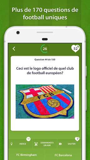 Le meilleur jeu quiz de football 2023 est là! Connaissez-vous les réponses à toutes questions de football? Quiz Football est une des jeux de foot quiz gratuite avec les questions et réponses les plus intéressantes et les plus amusantes. Téléchargez maintenant et complétez toutes les questions de football avant que quelqu\un d\autre ne termine ce Quiz Football! Combien connaissez-vous vraiment le sujet secondaire le plus important au monde? Jouez à ce quiz football joueur et répondez les meilleures questions de quiz football à propos de la Ligue des Champions, de la Coupe du Monde, de la Coupe d\Europe, de la Copa America, de la Premier League, de la Bundesliga, de Primera et bien plus encore! Seulement 3% des fans de foot peuvent compléter ce quiz de football gratuit? Êtes-vous un d\entre eux? Savez-vous qui était l\idole de football de Zlatan? Quel joueur a joué plus de jeux Premier League que Manchester City? Combien de temps Lewandowski a-t-il besoin pour marquer 5 buts? Pensez-vous que vous connaissez la réponse à ces questions de football? Téléchargez Quiz Football et testez vos connaissances avec les questions et les réponses de quiz foot difficile! CARACTÉRISTIQUES DE QUIZ DE FOOTBALL: Quizz de Foot dans 14 langues différentes: arabe, bulgare, chinois, croate, anglais, français, allemand, italien, polonais, portugais, russe, serbe, espagnol et thaïlandais Indice - si vous êtes coincé sur une certaine question, l\indice peut vous aider Sauter la demande, perdre une vie et passer à la prochaine question du quiz football Les coeurs sont vos vies, chaque réponse incorrecte est un coeur moins Demandez à un ami pour l\aide, si vous manquez des indices Certificat - vous l\obtenez une fois que vous avez répondu à toutes les questions du questionnaire Les quiz rapide amusants en général sont une excellente façon de passer un bon moment et d\apprendre quelque chose de nouveau. Avec autant de questions de foot et de réponses au questionnaire + des faits amusants pour chacun d\eux, ce Quiz Football est un numéro 1 parmi les applications. Avec une possibilité de répondre questions de quiz rapide dans différentes langues, ce Quizz de Foot est beaucoup plus intéressant! Donc, téléchargez Quiz Football et profitez d\apprendre de nouveaux faits intéressants à travers questions et réponses au quiz rapide! INFORMATIONS LÉGALES Les images utilisées dans Quiz Football sont sous Public Domain ou Creative Commons License. Pour plus d\informations, visitez la section À propos de l\application dans l\application elle-même. Quiz Football est une propriété intellectuelle de Quizzes by Peaksel.