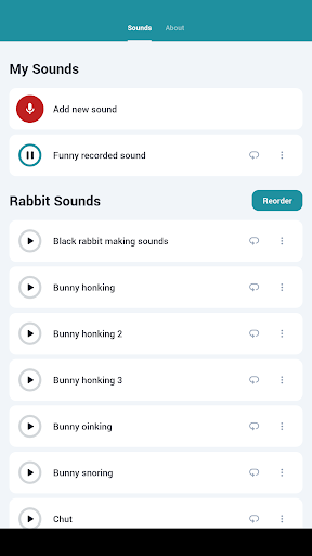 Ever wondered what a rabbit sounds like ? Look no further ! Add your own custom sound recorded from in the app! Just press the button and listen to all the sounds. Longclick to save the sounds to a local folder to use in other apps ! Longclick to save as notification sound Longclick to save as ringtone sound. Loop sounds with the loop button at the top. Any suggestions or questions ? Be sure to mails us ! Have fun and enjoy