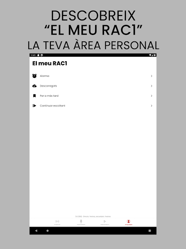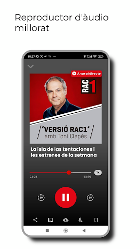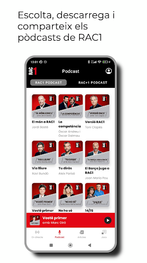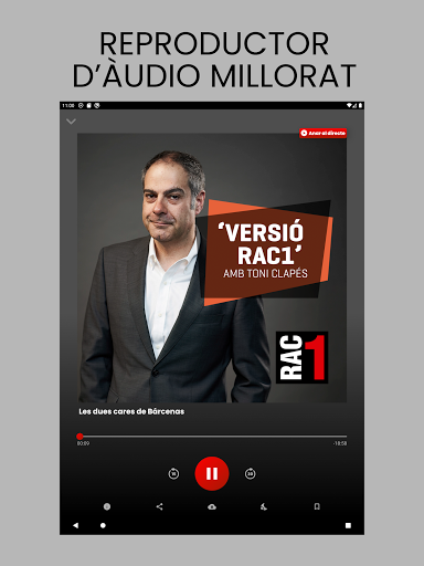 Descarrega\t l\aplicació oficial de RAC1, des del dispositiu, i gaudeix en tot moment de la millor informació i de les noves funcionalitats que t\oferim: – Escolta RAC1 en directe. – Segueix en directe els partits i altres esdeveniments esportius per RAC+1, el segon canal de RAC1, exclusivament digital. – Escolta i descarrega\t els pòdcasts íntegres de cada programa i de les seccions que més t\agradin. – Escolta i descarrega\t els pòdcasts de contingut exclusiu de RAC+1. – Podràs estar al dia amb totes les notícies publicades a RAC1.cat. – Ara podràs jugar mentre escoltes la ràdio i resoldre els reptes que planteja El Saberut. – Compatibilitat amb els cotxes que disposin de la tecnologia Android Auto. – Comparteix tot l’àudio de RAC1 i RAC+1 a les xarxes socials i envia l’àudio al teu televisor intel·ligent o altaveus intel·ligents. – Rep notificacions amb alertes d\interès i contingut destacat de RAC1. – Coneix al detall tots els programes de la nostra emissora de ràdio. – Accedeix a la teva àrea personal per gestionar les descàrregues i els pòdcasts desats o que hagis deixat a mitges. – Disposa de la funció alarma despertador i temporitzador. Ara pots despertar-te amb els programes de RAC1. I si ets dels que se\n van a dormir escoltant la ràdio, pots programar el temporitzador perquè s\apagui automàticament passat el temps que decideixis. Connecta amb la nostra aplicació i sigues part del \Tots som 1\.
