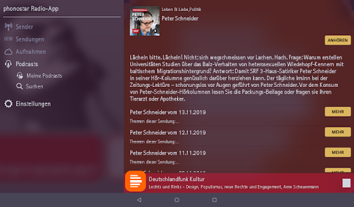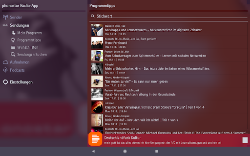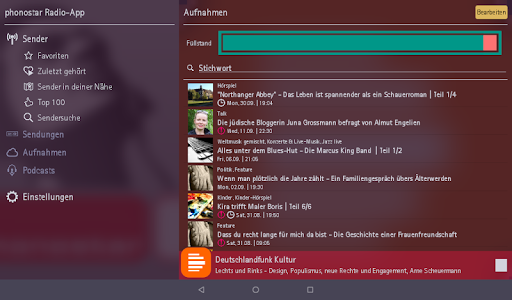 Radio – wann und wo es dir gefällt! Mit der phonostar Radio-App, der integrierten Radio-Cloud und Podcasts holst du dir die komplette Internetradio-Welt auf dein Mobilgerät! Rekorder für deine liebsten Radiosender, Podcatcher für deine lieblings Podcasts. Höre FM-Radios und DAB-Radios wie 1LIVE, WDR5, SWR oder Deutschlandfunk sowie Internetradios und Webradios wie Technobase.fm, Ballermannradio oder Top100Station: Mit phonostar kannst du live hören und aufnehmen, egal wo du gerade bist: +++ Über 30.000 Radiosender aus aller Welt +++ Radio aufnehmen +++ Programmguide +++ Podcasts +++ Sleeptimer +++ Android Auto Support +++ Intuitives Design °°° RADIO FINDEN, HÖREN & AUFNEHMEN°°° Mit über 30.000 Sendern bietet die phonostar Radio-App eine riesige Auswahl. Diverse Funktionen garantieren, dass du diese Sender schnell finden, bestmöglich hören und optimal verwalten kannst. + Hörspiele und Konzerte, die du an einem beliebigen Rechner mit unserer Radio-Cloud einprogrammiert hast, stehen dir mit der integrierten Radio-Cloud ab sofort in der App zur Verfügung. Aufnahmen kannst du auch von unterwegs einplanen. + Nach einer kostenlosen Registrierung stehen jedem zwei Stunden Aufnahmekapatität zur Verfügung, die man beliebig oft nutzen kann. + Abonniere Podcasts: In einem Podcast werden Audioinhalte onDemand zur Verfügung gestellt. Stöbere durch das Podcast-Angebot und finde die Podcasts nach deinen Wünschen. Die Radio-App ist auch dein Podcatcher. + Schnellsuche: Sendernamen, Stichwort, Genre oder Land eintippen und schon werden passende Sender angezeigt + Ausführliche Suche: Sender durchsuchen in mehr als 70 Genres, über 120 Ländern, nach Namen, Stichwort, Sprachen und Sendertypen + Hören mit einem Touch: Antippen eines Senders startet sofort die Wiedergabe + Favoriten: der Schnellzugriff auf alle Lieblingssender + Zuletzt gehört: alle kürzlich gespielten Sender auf einem Blick + Top 100: die beliebtesten Sender der Hörer in der Komplettübersicht + Automatische Streamauswahl: je nach Internetverbindung wird der bestgeeignete Stream des Senders abgespielt + Zusatzinformationen zu jedem Sender: Beschreibung, Genre, Land, Sprache, Logo °°° SENDER AUFNEHMEN °°° Radio dann hören, wenn du Zeit hast – die phonostar Radio-App wird mit einer Aufnahmefunktion zum Rekorder. Das Beste dabei: Du kannst eine Sendung unterwegs aufnehmen, ohne dass dafür dein Datenvolumen belastet wird. + Aufnahmefunktion: Sendungen bequem in der Cloud aufnehmen + Aufnahmen: Alle Aufnahmen können in \Aufnahmen\ angehört werden – auch die, die du mit deiner Radio-Cloud am Rechner zu Hause oder im Büro aufgenommen hast. + Aufnahmen verwalten: Aufnahmen löschen mit wenigen Fingertipps °°° SENDUNGEN FINDEN & HÖREN °°° Einzigartig und nur in der Radio-App von phonostar: ein Programmguide für Radiosendungen, die phonostar-Programmtipps, Wunschlisten, das persönliche Radioprogramm und die praktische Cloud-Funktion. + Programmguide: mehr als 15.000 Sendungen täglich finden nach Stichworten und 70 Genres, wie zum Beispiel Hörspiel, Konzert, Musik, DJ-Set, Kinder oder Sport + Programmtipps: die besten Sendungen täglich empfohlen von der phonostar-Redaktion + Wunschlisten: automatisch und täglich aktuell Sendungen ganz nach dem eigenen Geschmack finden lassen – Stichwort oder Genre eingeben und der App dauerhaft die Suche überlassen + Zusatzinformationen zu jeder Sendung: Beschreibung, Genre, Vorschau, Sendezeit, Sender + Sendungen mitschneiden: sich Sendungen, die man nicht verpassen will, mitschneiden lassen + Mein Programm: das ganz persönliche Radioprogramm mit allen Treffern aus den Wunschlisten Wiedergabe im Hintergrund Du kannst natürlich auch Radiohören, wenn die App im Hintergrund ist oder dein Speerbildschirm aktiv ist. Dazu verwendet die App \FOREGROUND_SERVICE\.