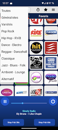 \Radios Françaises\ est une application gratuite et sans publicité (sauf celle diffusée par les stations) qui permet d\écouter tout simplement la radio sur votre smartphone ou votre tablette partout dans le monde. L\application ne collecte ni ne partage aucune donnée. Pour remplacer les pubs par de la musique pendant 30 où 60 secondes : click sur l\un des boutons \Stop Pub\. L\un des réseaux Wifi, 3G, 4G ou 5G est nécessaire. Classement des radios par thèmes. Pour écouter une radio il suffit de cliquer sur son logo. Vous pouvez ajouter vos radios préférées dans les Favoris. Pour supprimer un Favoris : Dans le panneau Favoris, long clic sur l\icone du Favoris à supprimer. Fonctionne même quand le téléphone est en veille. Vous pouvez programmer l\heure d\arrêt de l\application. Mise en pause automatique de l\application lors d\un appel téléphonique lorsque le téléphone est sur sonnerie. Autoriser les notifications permet de voir nom de la radio quand l\écran est en veille. Pour la Radio Réveil l\application doit être active ou en veille. Une bonne connexion réseau est nécessaire. Tester cette fonction de l\application sur votre appareil avant utilisation. Liste des radios : BFM Radio Chante France Chérie Europe 1 Evasion FG. FIP France bleu France culture France info France inter France musique Fun radio Générations Jazz radio MFM radio Mouv\ Nostalgie Nova NRJ OÜI FM Radio classique RFI RFM Rire et chansons RMC RTL RTL2 Skyrock Sud radio Swigg TSF jazz Vibration Virgin radio Voltage Et bien d\autres encore … Bonne écoute et merci pour vos commentaires.